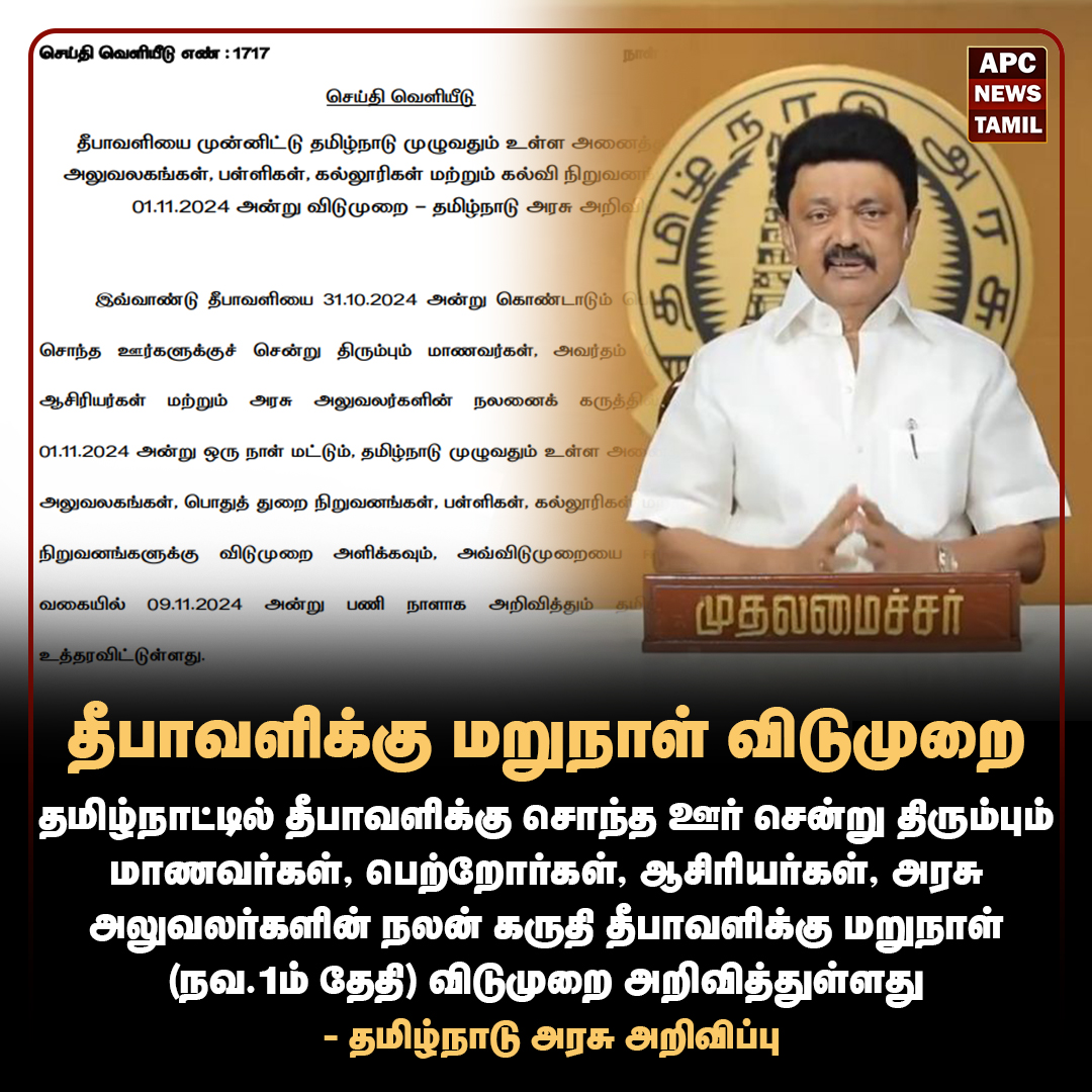 தமிழ்நாட்டில் தீபாவளிக்கு மறுநாள் விடுமுறைBy admin - அக்டோபர் 17, 2024 11:37 மணிFacebookXPinterestWhatsApp Advertisement
