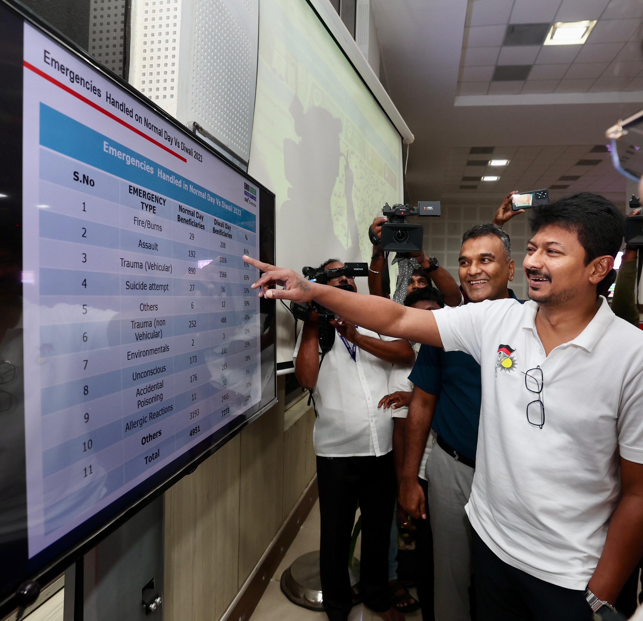 பின்னர் செய்தியாளர்களை சந்தித்த துணை முதலமைச்சர் உதயநிதி, தீபாவளி நேரத்தில் விபத்துக்களை தவிர்க்க வேண்டும் என்ற நோக்கத்தில் முதலமைச்சரின் உத்தரவின்பேரில் பல்வேறு நடவடிக்கைகள் மேற்கொள்ளப்பட்டு உள்ளதாக தெரிவித்தார். 108 அவசர கால சேவை மையத்திற்கு ஒரு நாளைக்கு சராசரியாக 12 ஆயிரம் அழைப்புகள் வரும் நிலையில், தீபாவளி நேரம் என்பதால், 20 ஆயிரம் அழைப்புகள் வரக்கூடும் என்று எதிர்பார்க்கப்படுவதாகவும், அதற்காக, அவசரகால மேலாண்மை மையம் 3 shift-களிலும், கூடுதலாக, 50 பேர் பணி அமர்த்தப்பட்டு, மொத்தம் 194 நபர்கள் அழைப்புகளை ஏற்கும் வகையில் பணியில் ஈடுபட்டுள்ளதாகவும் துணை முதலமைச்சர் உதயநிதி குறிப்பிட்டார்.
