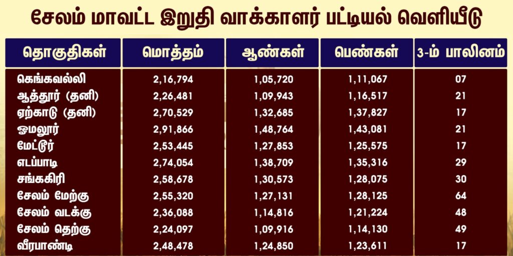தமிழக சட்டமன்றத் தேர்தல் 2026-க்கான அறிவிப்பு வெளியாகியுள்ள நிலையில், சேலம் மாவட்டத்திற்கான இறுதி வாக்காளர் பட்டியலை மாவட்ட நிர்வாகம் வெளியிட்டுள்ளது. இதன்படி, மாவட்டத்தில் உள்ள 11 சட்டமன்றத் தொகுதிகளிலும் சேர்த்து மொத்த வாக்காளர்களின் எண்ணிக்கை சுமார் 29.99 லட்சம் முதல் 30.30 லட்சம் வரை உள்ளதாகத் தெரிவிக்கப்பட்டுள்ளது.