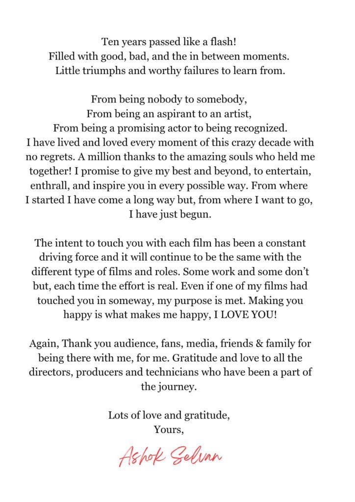 நடிகர் அசோக் செல்வன் சினிமா துறைக்கு வந்து 10 ஆண்டுகள் நிறைவு பெற்றதை அடுத்து உருக்கமான பதிவு வெளியிட்டுள்ளார்.
