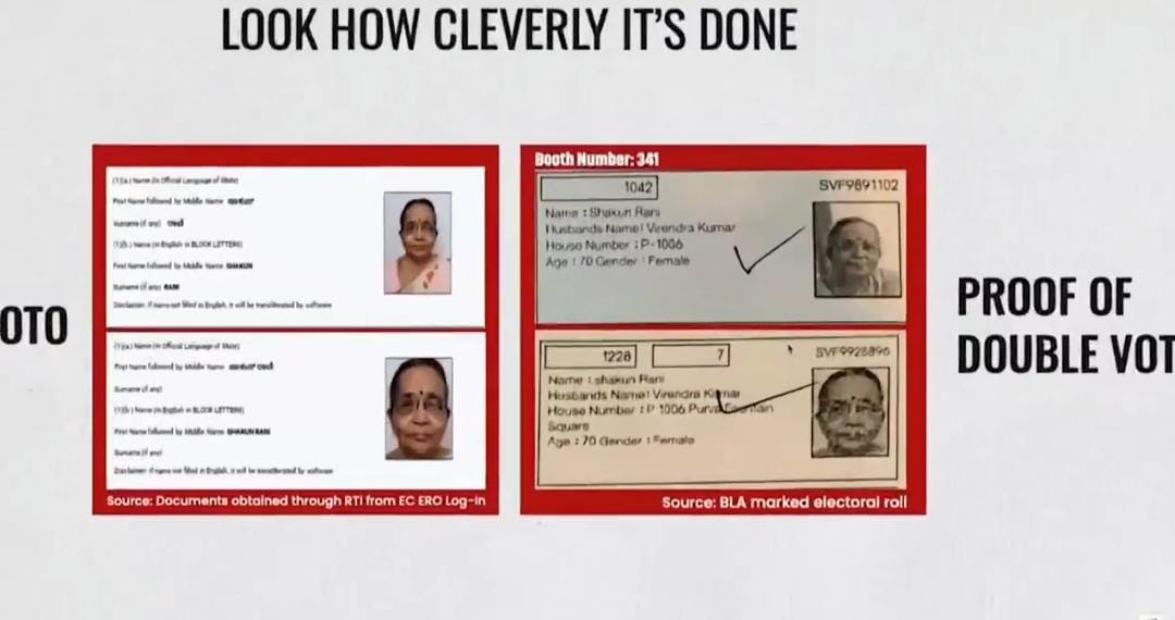 மகாதேவபுரா சட்டமன்றத் தொகுதி வாக்காளர் பட்டியலை விரிவாக ஆராய்ந்ததில், இந்த குறிப்பிட்ட சட்டமன்றத் தொகுதியில் 1,00,250 போலி வாக்காளர்கள் இருந்தனர். இதிலிருந்து பாஜக 1,14,046 வாக்குகள் வித்தியாசத்தில் முன்னிலை வகித்தது. மகாதேவபுரா தொகுதியில்  11,965 பேர் போலி வாக்காளர்கள் கண்டறியப்பட்டனர். 40,009 வாக்காளர்கள் போலி அல்லது செல்லாத முகவரிகளைக் கொண்டிருந்தனர். ஒற்றை முகவரிகளில் 10,452 வாக்காளர்கள் பதிவு செய்யப்பட்டுள்ளனர். அதாவது ஒரு அறை வீடு போன்ற இடங்களில் 80 வாக்காளர்களைக் காட்டின. ஆனால், உண்மையில் யாரும் அங்கு வசிக்கவில்லை. வாக்காளர் பட்டியலில் செல்லாத புகைப்படங்களுடன் 4,132 வாக்காளர்கள் இருந்தனர். மேலும், புதிய வாக்காளர்களுக்கான படிவம் 6 மிகவும் தவறாகப் பயன்படுத்தப்பட்டதும் ஆய்வில் தெரியவந்தது. புதிய வாக்காளர்களின் வயது பொதுவாக 18 முதல் 25 வயது வரை இருக்க வேண்டும். ஆனால் இந்த வகையில் 98, 97, 85, 75 வயது வரை உள்ள வாக்காளர்கள் இருந்தனர்.  இந்த முதல் முறையாக வாக்காளர்களில் 18 முதல் 25 வயதுக்குட்பட்ட ஒரு நபர் கூட இல்லை. மகாதேவபுராவின் ஒரு சட்டமன்றத் தொகுதியில் உள்ள ஒவ்வொரு வாக்காளரையும் சரிபார்க்க சுமார் 40 பேர் கொண்ட குழுவுக்கு 6 மாதங்கள் ஆனது. இது ஒரு உதாரணம் மட்டுமே, நாட்டின் பிற பகுதிகளிலும் இதே முறைதான் என்று காங்கிரஸ் கட்சி உறுதியாக நம்புகிறது.