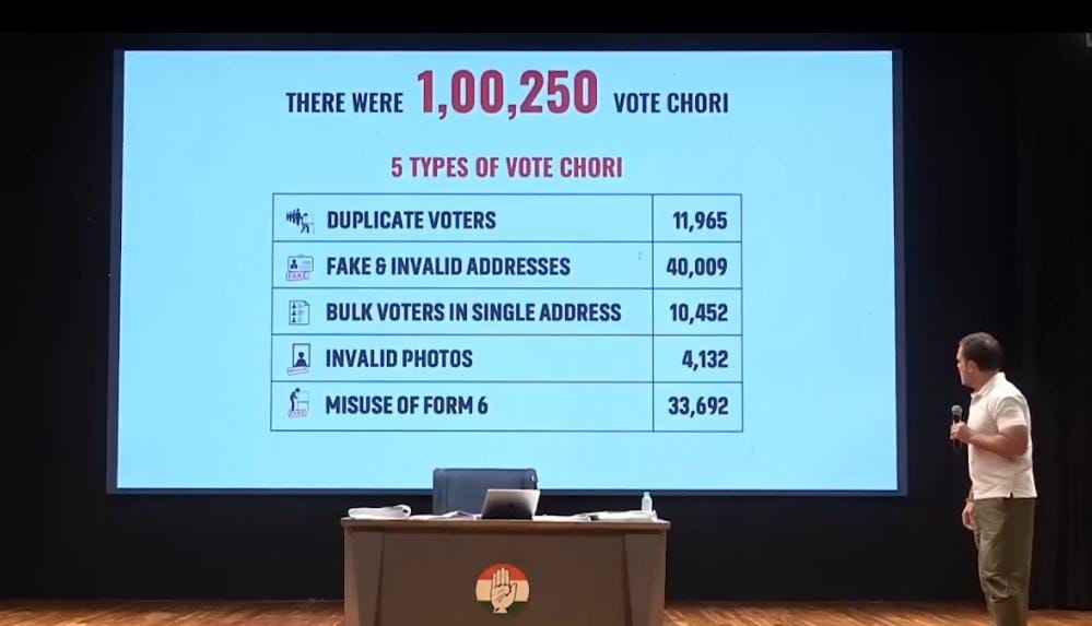 மக்களவை எதிர்க்கட்சித் தலைவர் ராகுல்காந்தி இன்று பிற்பகல் டெல்லியில் செய்தியாளர்களை சந்தித்து பேசினார். அப்போது, பாஜக தேர்தலைத் திருடும் பல வழிகளை பட்டியலிட்டு, விரிவான பவர்பாயிண்ட் விளக்கக்காட்சியை வழங்கினார்.  அப்போது ராகுல்காந்தி பேசியதாவது:- கர்நாடக மாநிலம் பெங்களூரு மத்திய நாடாளுமன்றத் தொகுதிக்கு உட்பட்ட மகாதேவ்புரா சட்டமன்றத் தொகுதி தேர்தல் முடிவுகள் குறித்து விரிவாக மேற்கொள்ளப்பட்ட ஆய்வின்போது வெளியான உண்மைகளை அவர் வெளியிட்டார். அதன்படி, மகாதேவ்புரா சட்டமன்றத் தொகுதியில் 2024 பொதுத்தேர்தல் முடிவுகள் மற்ற சட்டமன்றத் தொகுதிகளிலிருந்து முற்றிலும் மாறுபட்ட முறையைக் காட்டியது.  பெங்களூரு மத்திய நாடாளுமன்றத் தொகுதிக்குள் வரும் 8 சட்டமன்றத் தொகுதிகளில், மகாதேவ்புரா சட்டமன்றத் தொகுதியின் வாக்குப்பதிவு முறை சந்தேகத்திற்குரியதாக அமைந்திருந்தது. அந்த தொகுதியில் பாஜக வேட்பாளர் 1,14,046 வாக்குகள் முன்னிலை வகித்தார். அதேவேளையில் மகாதேவ்புராவில் உள்ள மற்ற தொகுதிகளின் தோல்விகளை உள்ளடக்கியதாக இந்த நாடாளுமன்றத் தொகுதியில் பாஜக வேட்பாளர் 32,707 வாக்குகள் வித்தியாசத்தில் வெற்றி பெற்றார்.