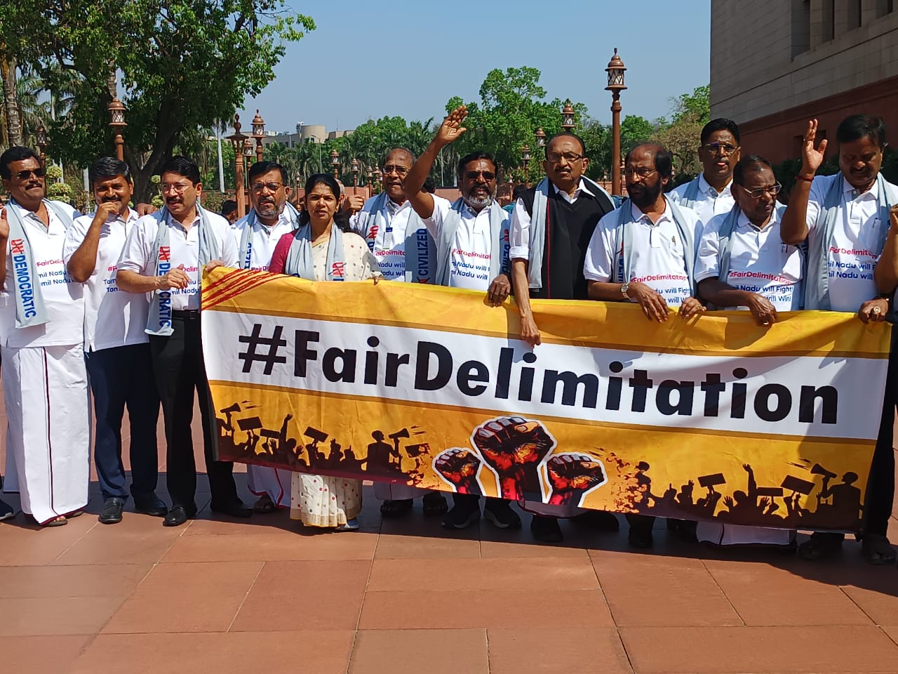 முதல் முழக்கத்தை முதலமைச்சர் தொடங்கி வைத்தார். தமிழ்நாடு வெல்லும், தமிழ்நாடு போராடும் என்று. அதைதான் இன்று நாடாளுமன்றத்தில் வாசகமாக அணிந்து சென்றார்கள். அதற்கு ஏன் இவ்வளவு பதற்றமடைய வேண்டும் பேரவைத் தலைவர். இது ஒரு ஜனநாயக மரபு தானே. தங்களுடைய நிலைப்பாட்டை நாடாளுமன்றத்தில் தெரிவிக்கிறார்கள். டிலிமிட்டேஷன் என்பது எத்தகைய மனநிலையை ஏற்படுத்தியுள்ளது. அது தமிழகத்தை எப்படி போராட தூண்டியுள்ளது என்பதை நாடாளுமன்ற மைய மண்டபத்திற்கு வந்து தமிழக எம்.பிக்கள் வெளிப்படுத்தியுள்ளனர். இதற்கே அச்சப்பட்டுக்கொண்டு ஓம்பிர்லா நாடாளுமன்றத்தை ஒத்திவைக்கிறார் என்றால் இனி நீங்கள் நாடாளுமன்றத்தை எப்படி நடத்திவிட போகிறீர்கள். அடுத்தக்கட்ட நகர்வு உங்களுக்கு எப்படியானதாக இருக்க வேண்டும் என்று நீங்கள்தான் முடிவு செய்ய வேண்டும்.