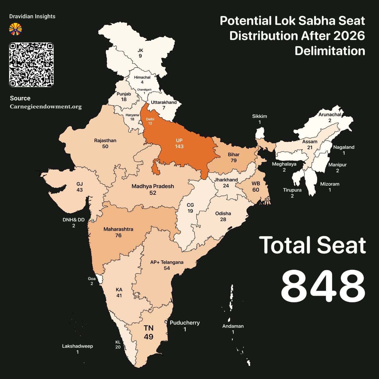 2026க்கு பிறகான முதல் மக்கள்த் தொகை கணக்கெடுப்பு அடிப்படையில் தொகுதிகள் will be Readjusted, will be Redistributed என்றுதான் சொல்கிறார்கள். இதற்கு நாம் எந்த வரையறை வேண்டும் என்றாலும் வைத்துக்கொள்ள முடியும். Redistribution என்பது வளர்ந்தவர்களுக்கு தண்டனையாக மாறிவிடக் கூடாது என்பதை அடிப்படை கோட்பாடாக வைத்துக்கொண்டு இந்த முன்மொழிவை பரிசீலித்தால் அது சரியாக இருக்கும். அப்படி செய்வார்களா? என்பது சந்தேகம். ஆனால் இந்த பிரச்சினையை இப்படியே கொண்டு சென்றால் தமிழ்நாட்டு மக்கள் இதனை புரிந்து கொள்வார்கள். 543ல் தற்போது 40 தொகுதிகள் உள்ளன. அது இத்தனை சதவிகிதம் உள்ளது. அப்போது, 848ல் 31 அல்லது 40 என்பது என்ன சதவீதம் உள்ளது?. அப்படி என்றால் தமிழநாட்டிறகு நாடாளுமன்றத்தில் பிரதிநிதித்துவம் என்ன?
