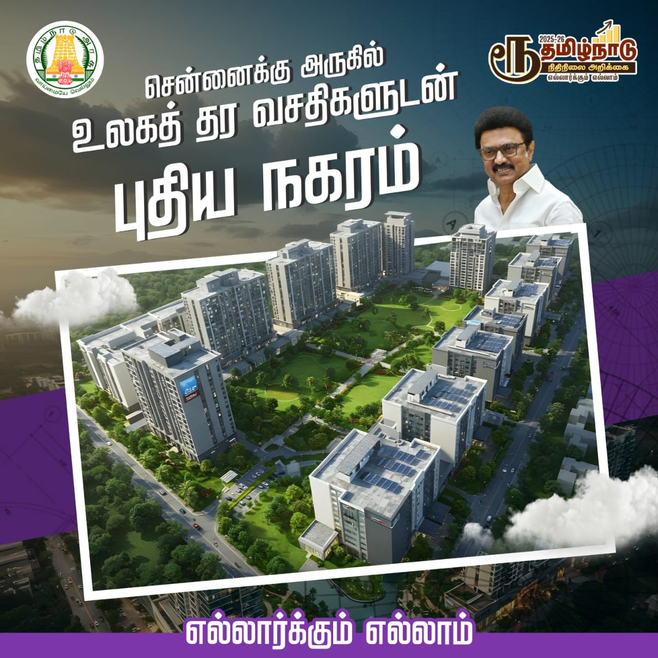சென்னைக்கு அருகில் புதிய நகரம் 2000 ஏக்கர் பரப்பளவில் அமைக்கப்படும் என்று பட்ஜெட்டில் சொல்லி இருக்கிறார்கள். இது மிகவும் முக்கியமான திட்டமாகும். சென்னையில் இன்று 1.25 கோடி மக்கள் வசிக்கிறார்கள். அப்போது இந்த நகரம் அப்படியே இருக்க முடியாது. பல பெரிய நகரங்கள், தங்களுக்கு அருகில் குட்டி நகரங்களை உருவாக்குவது என்பதும் வளர்ச்சிதான். டெல்லிக்கு அருகில் குர்கான், நொய்டாவும் உருவாகி, 3 நகரங்களும் இணைந்து தேசிய தலைநகர பகுதியாக உள்ளது. மும்பை அருகேயும் இதுபோன்ற நகரங்கள் இருக்கின்றன. சென்னைக்கு துணைக்கோள் நகரம் அமைக்க வேண்டி 20 வருடங்களுக்கு முன்பாகவே பேசி, அது நடக்காமல் போய்விட்டது. இப்போது கட்டாயம் புதிய நகரத்தை உருவாக்க வேண்டும். சென்னையில் இன்றைய நிலையில் இருக்கும் வாகன போக்குவரத்து நெரிசல் என்ன? பட்ஜெட்டில் சொல்ல வருவது பூந்தமல்லி, ஸ்ரீபெரும்புதூர், செங்கல்பட்டு வரை சென்னைதான். இனி எதை செய்தாலும் அதற்கு அந்த பக்கம் செல்ல வேண்டும். அல்லது ஒட்டிப்போட வேண்டும். பிரச்சினை என்றால் மற்ற நகரங்களையும் வளர்க்க வேண்டும். சுத்தி இருக்க இடங்களில் மாற்று மையங்களை உருவாக்கிட வேண்டும். இல்லாவிட்டால் சென்னைதான் மீண்டும் பாதிக்கப்படும்.
