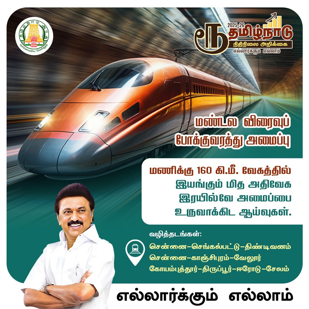 இதில் முக்கியமான விஷயம் என்ன என்றால், தமிழ்நாட்டிற்கான ரயில் சேவை என்பது மத்திய அரசை சார்ந்து பயன் கிடையாது. காலங்காலமாக கெஞ்சி கூத்தாடியபோதும் ரயில் பாதைகள் பெரிதாக வளர்ச்சி அடையவில்லை. சென்னை மெட்ரோவோ, மத்திய – மாநில அரசுகளின் பங்களிப்பில் உள்ளதுதான்.தற்போது பட்ஜெட்டில் செமி ஹைஸ்பீடு ரயில் சேவை குறித்து பேசியுள்ளனர். அதை படிக்கும்போது அவ்வளவு மகிழ்ச்சியாக உள்ளது. காஞ்சிபுரம், வேலூர், திருவண்ணாமலை பகுதிகளில் வேகமாக செல்வதற்குரிய சாலை வசதிகள் கிடையாது. அதன்காரணமாக தமிழ்நாட்டில் 3 இடங்களில் 160 கி.மீ வேகத்தில் இயங்கக்கூடிய செமி ஹைஸ்பீடு ரயில் திட்டத்தை தமிழக அரசே முன்வந்து செயல்படுத்த உள்ளது. வழக்கமான ரயில்பாதையில் வந்தே பாரத் ரயிலுக்கு மேல் இயக்க முடியாது. சீனாவில் உள்ள ஹைஸ்பீடு ரயில்கள் உலக பிரசித்தி பெற்றதாகும். 250 முதல் 300 கிலோ மீட்டர் வேகத்தில் செல்லும் திறனுடையதாகும். இந்த ரயில் மூலம் சென்னை நகரம் வளராது. இங்கிருந்து வேலுருக்கு நீங்கள் ஒரு மணி நேரத்தில் செல்ல முடியும் என்றால் ஏன் வேலூர், காஞ்சிபுரத்தை சேர்ந்தவர்கள் சென்னையில் வீடு வாங்க போகிறார்கள். வெளியூரில் இருந்து வருபவர்களுக்கு சென்னை தங்குவதற்கு காஸ்ட்லியாக இருந்தால் ராணிப்பேட்டையில் தங்கிவிட்டு போய் வரலாம் அல்லவா? அதேபோல் திண்டிவனம் வரை ஒரு ஹைஸ்பீடு வழித்தடமும், மற்றொன்று வேலூர் வரையிலும் மற்றொன்று கோவை அருகிலும் அமைக்கப்படுகிறது. இதுதான் வளர்ச்சியாகும். இப்போது இந்த மொத்த பகுதிகளுக்கு வளர்ச்சி சரிசமமாகிவிடும், இவ்வாறு அவர் தெரிவித்தார்.