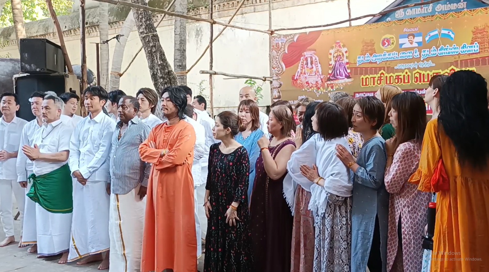 உலக நன்மைக்காகவும், மக்கள் அமைதியுடன் வாழ வேண்டி ஜப்பான் நாட்டில் இருந்து தமிழகத்தில் உள்ள கோவில்களை காண இவர்கள் வந்திருந்தனர். வேட்டி சட்டையுடன் இருந்த ஜப்பான் நாட்டினரை வியந்து பார்த்த பலர் தங்கள் செல்போனில் செல்பி எடுத்துக்கொண்டனர்.