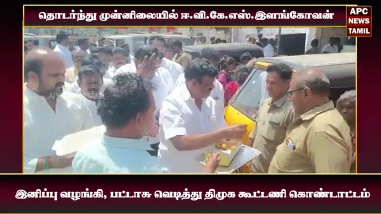 ஈரோடு இடைத்தேர்தலில் திமுக கூட்டணி காங்கிரஸ் வேட்பாளர் ஈவிகேஎஸ். இளங்கோவன் வாக்கு எண்ணிக்கையில் வெற்றியை நோக்கி சென்று கொண்டிருக்கிறார் என்பதால் இனிப்புகள் வழங்கி கொண்டாடி கொண்டிருக்கிறார்.