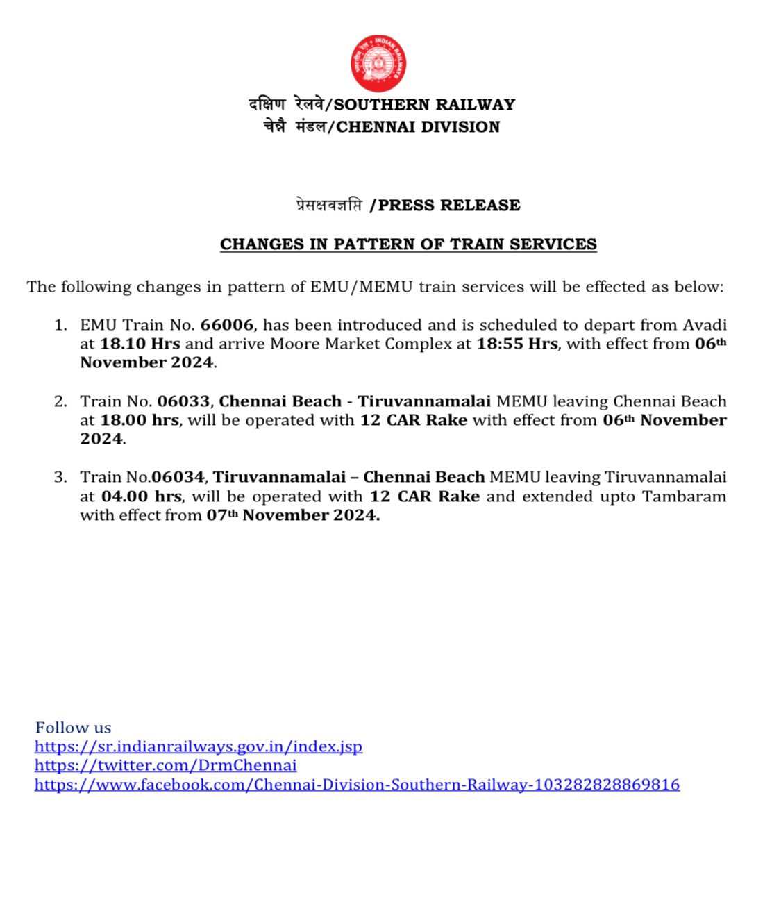இதேபோல், வரும் 6ஆம் தேதி முதல் சென்னை கடற்கரை – திருவண்ணாமலை இடையே செல்லும் மின்சார இரயில் 12 பெட்டிகளாக இயக்கப்படும் என தென்னக ரயில்வே அறிவித்துள்ளது. மறுமார்க்கத்தில் திருவண்ணாமலை – சென்னை கடற்கரை இடையிலான மின்சார ரயில் வரும் 7ஆம் தேதி முதல் 12 பெட்டிகளாக இயக்கப்படும் என்று தென்னக ரயில்வே அறிவித்துள்ளது.