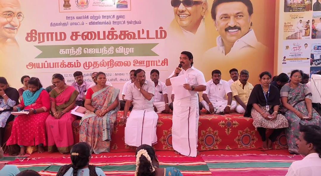 சென்னை அயப்பாக்கம் ஊராட்சியில் காந்தி ஜெயந்தியை ஒட்டி கிராம சபை கூட்டம் ஊராட்சி மன்ற தலைவர் துரை வீரமணி தலைமையில் நடைபெற்றது. இக்கூட்டத்தில் மதுரவாயில் எம்.எல்.ஏ காரம்பாக்கம் கணபதி சிறப்பு விருந்தினராக கலந்து கொண்டார். இதில் ஊராட்சியின் வரவு செலவுகள், சுகாதாரம், குடிநீர் உள்ளிட்ட மக்கள் தேவைகள் குறித்து விவாதிக்கப்பட்டது.