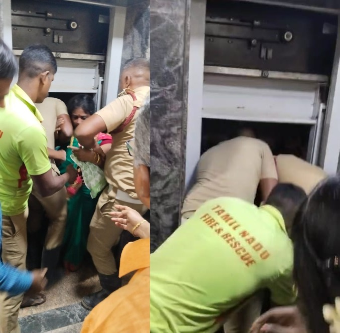 சென்னை மாதவரத்தில் திருமண மண்டபத்தில் உள்ள லிப்டில் சிக்கிக்கொண்ட 11 பேரை தீயணைப்பு வீரர்கள் போராடி மீட்டுள்ளனர்.