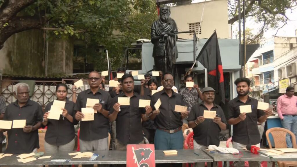 தமிழ்த்தாய் வாழ்த்து சர்ச்சை விவகாரத்தை கண்டித்து சென்னையில் திராவிடர் விடுதலைக் கழகம் சார்பில் ஆளுநருக்கு 1000 அஞ்சல் அனுப்பும் ஆர்ப்பாட்டம் போராட்டம் நடைபெற்றது.