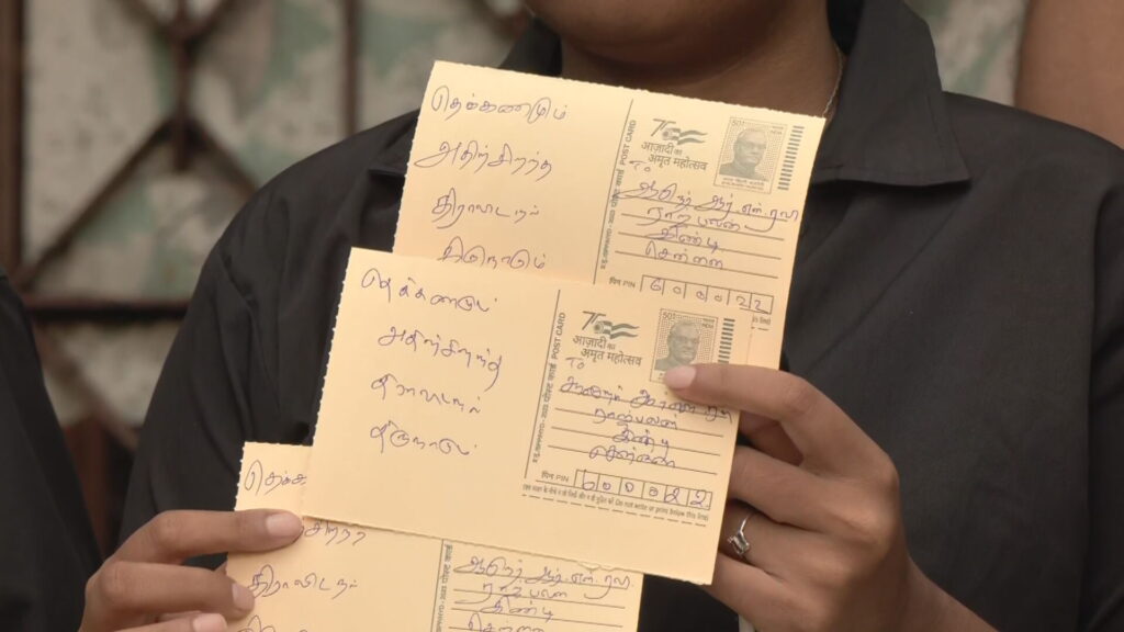இதன் ஒரு பகுதியாக சென்னை ராயப்பேட்டையில் திராவிடர் விடுதலைக் கழகம் சார்பில் ஆளுநர் ஆர்.என்.ரவிக்கு 1000 அஞ்சல் அனுப்பும் ஆர்ப்பாட்டம் நடைபெற்றது. இதில் திராவிடர் விடுதலைக் கழக நிர்வாகி உமாபதி தலைமையில் 20-க்கும் மேற்பட்டோர் கலந்துகொண்டு அஞ்சல் அட்டையில் “தெக்கணமும் அதிற்சிறந்த திராவிடநல் திருநாடும்” என்று எழுதி ஆளுநர் மாளிகைக்கு அனுப்பி வைத்தனர். மேலும், தமிழ்நாடு ஆளுநர் உடனடியாக வெளியேற வலியுறுத்தியும் கண்டன முழக்கங்களை எழுப்பினர்.