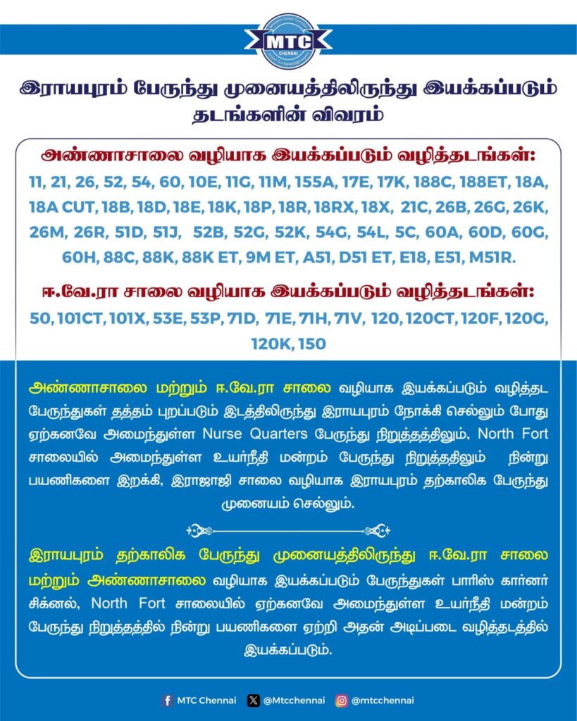 பயணிகள் கவனத்திற்கு: அண்ணா சாலை மற்றும் ஈ.வெ.ரா. சாலை வழியாக ராயபுரம் செல்லும் பேருந்துகள், ‘செவிலியர் குடியிருப்பு’ மற்றும் வடக்கு கோட்டை சாலையில் உள்ள ‘உயர்நீதிமன்ற’ நிறுத்தத்தில் பயணிகளை இறக்கிவிட்டு முனையத்திற்குச் செல்லும்.
