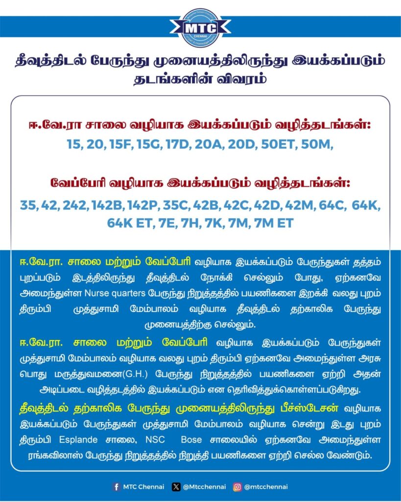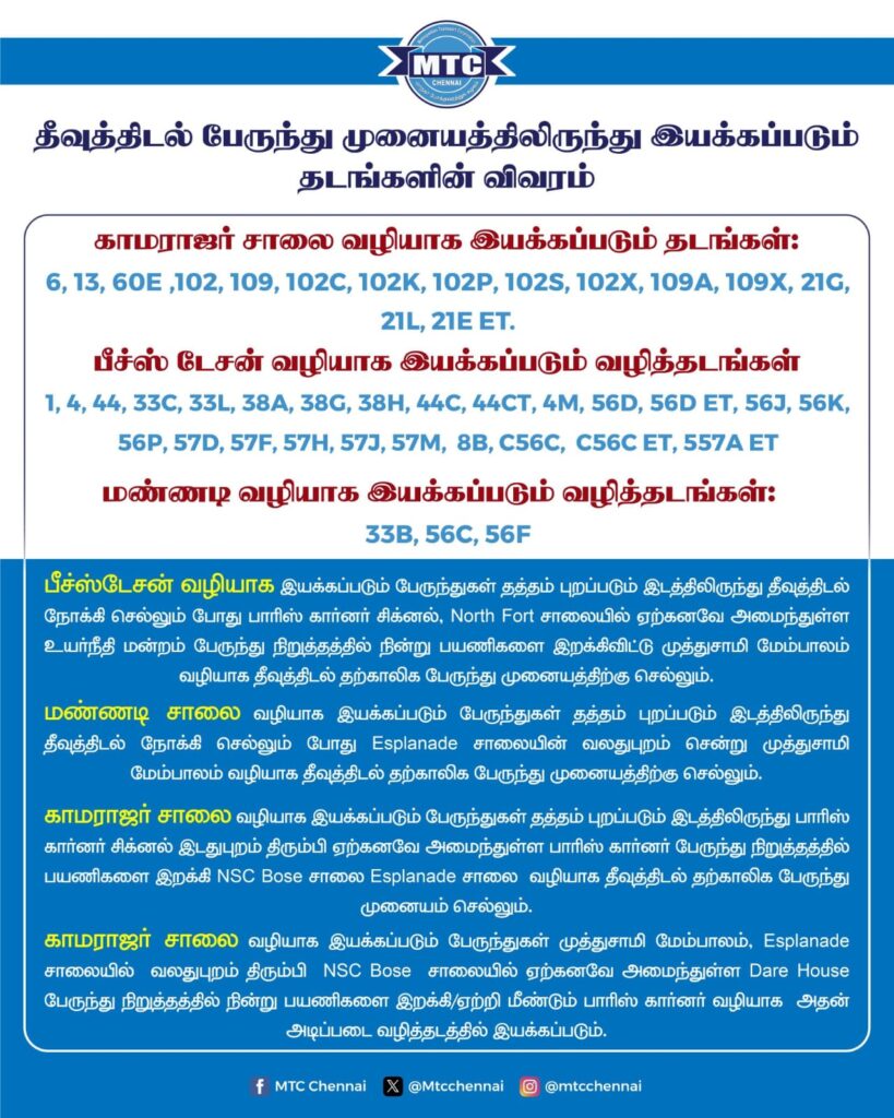 பயணிகள் கவனத்திற்கு: பீச் ரயில் நிலையம் வழியாக வரும் பேருந்துகள் முத்துசாமி மேம்பாலம் வழியாக தீவுத்திடல் சென்றடையும். மண்ணடி செல்லும் பேருந்துகள் எஸ்பிளனேட் சாலை அருகே நிறுத்தப்படும்.