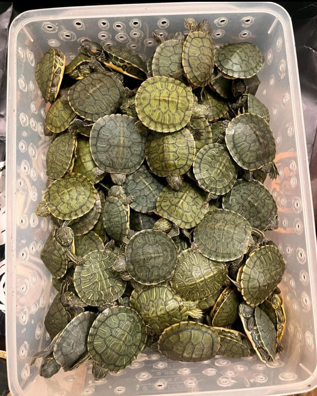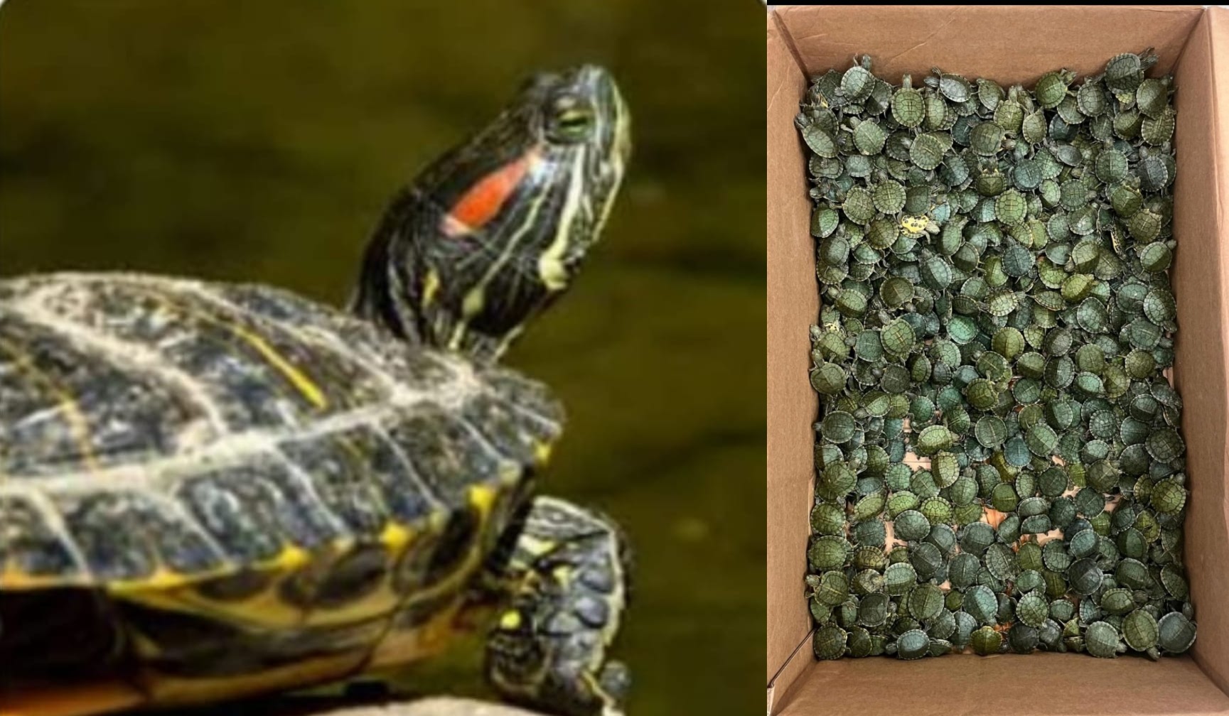 அப்போது அவர்கள் வைத்திருந்த அட்டைப் பெட்டிகளுக்குள், ஆயிரக்கணக்கான சிவப்பு காது அலங்கார நட்சத்திர ஆமைகள் உயிருடன் இருந்ததை கண்டுபிடித்தனர்.  சுமார் ரூ.75 லட்சம் மதிப்பிலான 5,400 சிவப்பு காது அலங்கார நட்சத்திர ஆமைகளை அதிகாரிகள் பறிமுதல் செய்தனர். பின்னர் மத்திய வனக்குற்றப்பரிவு அதிகாரிகள் பறிமுதல் செய்யப்பட்ட ஆமைகளை கைப்பற்றி ஆய்வு மேற்கொண்டனர். தாய்லாந்து, மலேசியாவில் அதிகமாக காணப்படும் இந்த ஆமைகள் அலங்கார தொட்டிகளில் வைத்து வளர்த்து வருகின்றனர். அதோடு மருந்து தயாரிக்கவும் பயன்படுத்தப் படுகின்றன.