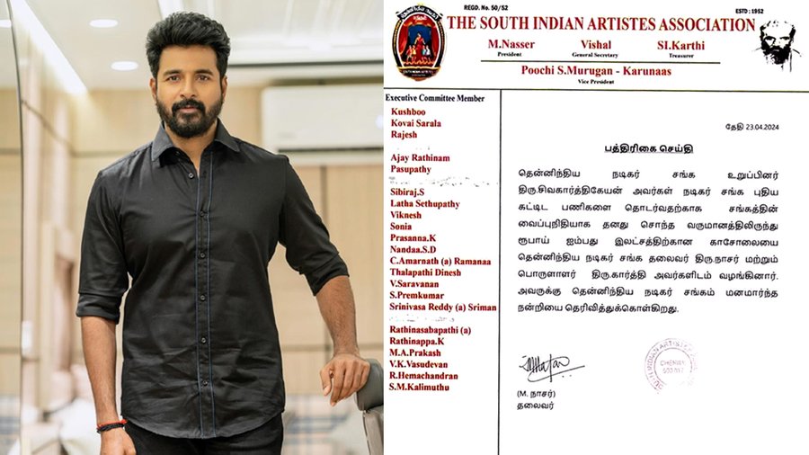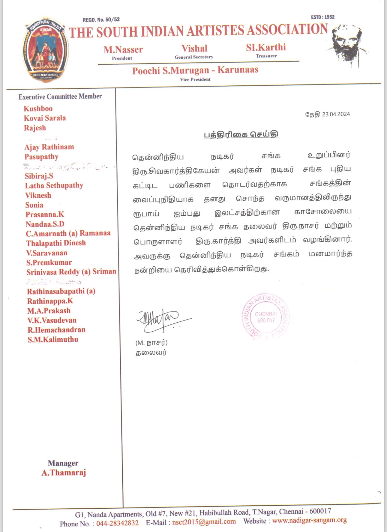 அந்த வகையில் சங்கத்தின் உறுப்பினர் சிவகார்த்திகேயன் நடிகர் சங்க புதிய கட்டடப் பணிகளை தொடர்வதற்காக சங்கத்தின் வைப்பு நிதியாக தனது சொந்தவருமானத்திலிருந்து சுமார் 50 லட்சம் ரூபாய்க்கான காசோலையை வழங்கி இருக்கிறார். தென்னிந்திய நடிகர் சங்கத் தலைவர் நாசர் மற்றும் பொருளாளர் கார்த்தியிடம் இந்த காசோலையை வழங்கினார். இதற்கு தென்னிந்திய நடிகர் சங்கமும் நன்றி தெரிவித்துள்ளது.