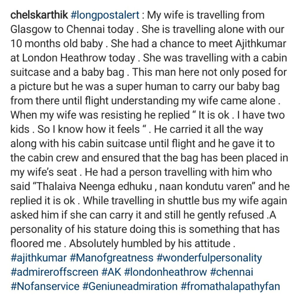 இதுகுறித்து தெரிவித்த அவர் “என் மனைவி இன்று கிளாஸ்கோவிலிருந்து சென்னைக்கு பயணம் செய்தார். எங்களுடைய 10 மாத குழந்தையுடன் தனியாக அவர் பயணம் செய்து வந்தார். அவருக்கு லண்டன் ஹீத்ரோவில் அஜித்குமாரை சந்திக்கும் வாய்ப்பு கிடைத்தது. அவர் ஒரு கேபின் சூட்கேஸ் மற்றும் குழந்தையுடன் பயணம் செய்தார்.