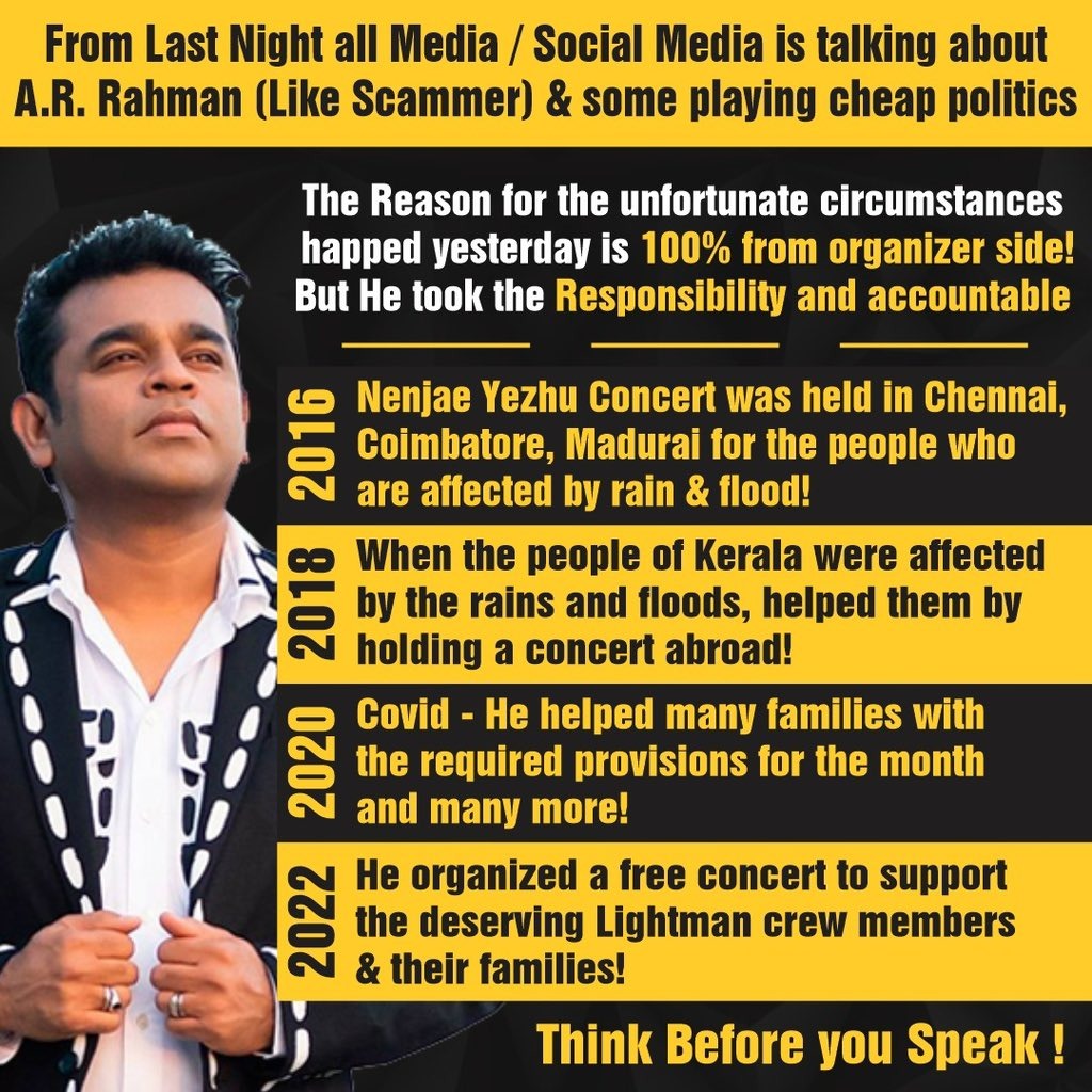 அதையடுத்து சினிமா லைட் மேன்கள் வாழ்வில் ஒளியேற்றுவதற்காக 2022 ஆம் ஆண்டு இசை நிகழ்ச்சி நடத்தினார். எனவே பேசுவதற்கு முன் யோசித்து பேசுங்கள்” என்று ஒரு பதிவு வெளியிடப்பட்டிருந்தது.