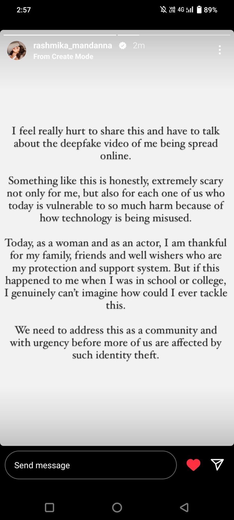 இந்நிலையில், டீப் ஃபேக் தொழில்நுட்பம் மூலம் நடிகை ராஷ்மிகாவை தவறாக சித்தரித்து வீடியோ ஒன்று இணையத்தில் வைரலாகி வருகிறது. இதற்கு வேதனை தெரிவித்து ராஷ்மிகா இணையத்தில் பதிவிட்டிருந்தார். இதற்கு கடும் கண்டனம் தெரிவித்துள்ள பல்வேறு பிரபலங்கள், இந்த விவகாரம் தொடர்பாக நடவடிக்கை எடுக்குமாறு வலியுறுத்தி உள்ளனர்.