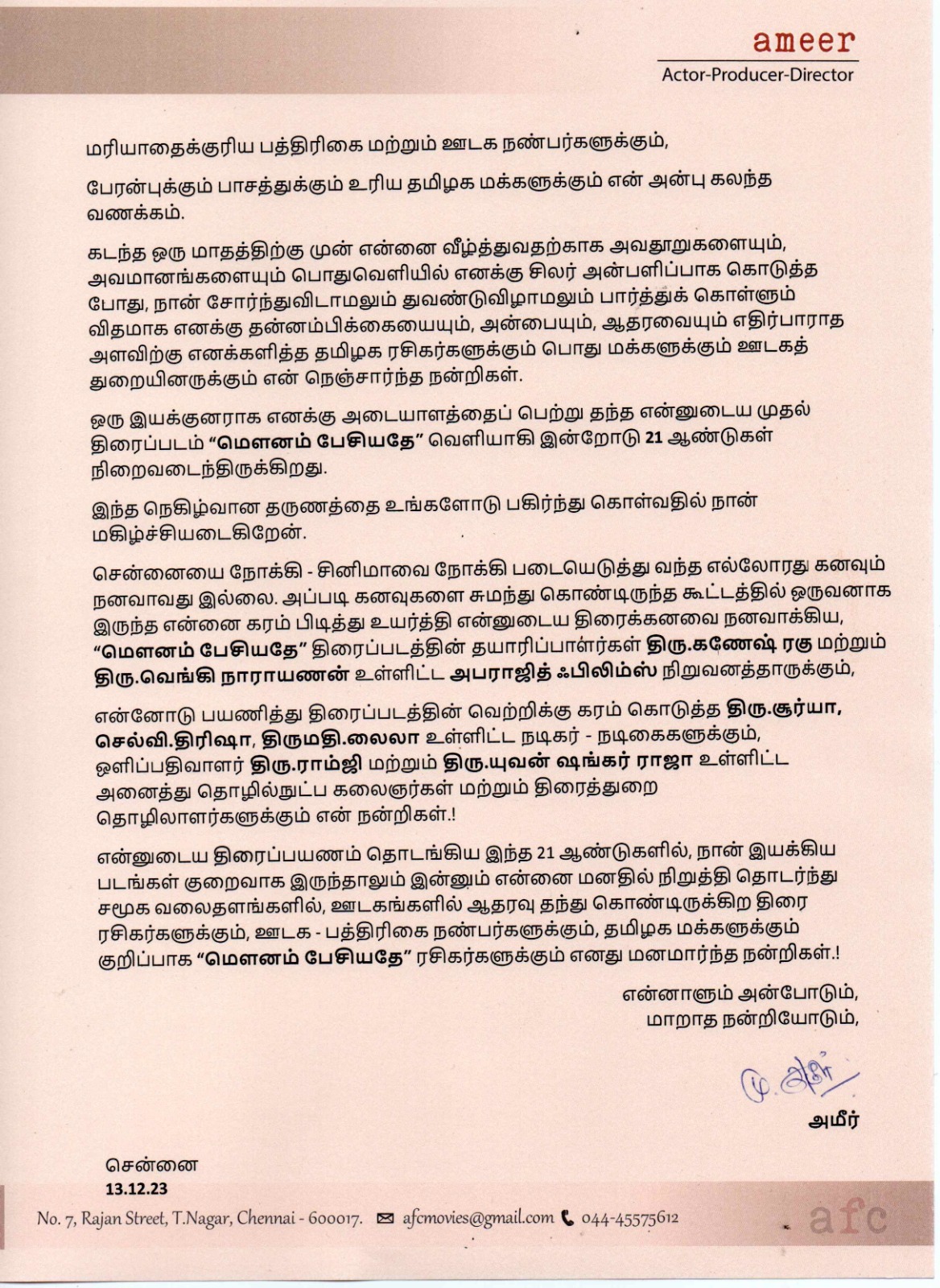 சென்னைக்கு சினிமாவை நோக்கி படையெடுத்து வந்த எல்லோரது கனவும் நனவாவது இல்லை. அப்படி கனவுகளை சுமந்து கொண்டிருந்த கூட்டத்தில் ஒருவனாக இருந்த என்னை கரம் பிடித்து உயர்த்தி என்னுடைய திரைக்கனவை நனவாக்கிய மௌனம் பேசியதே தயாரிப்பாளருக்கு நன்றி. என்று அதில் இயக்குநர் அமீர் தெரிவித்துள்ளார்.