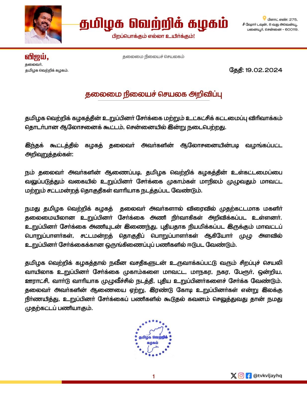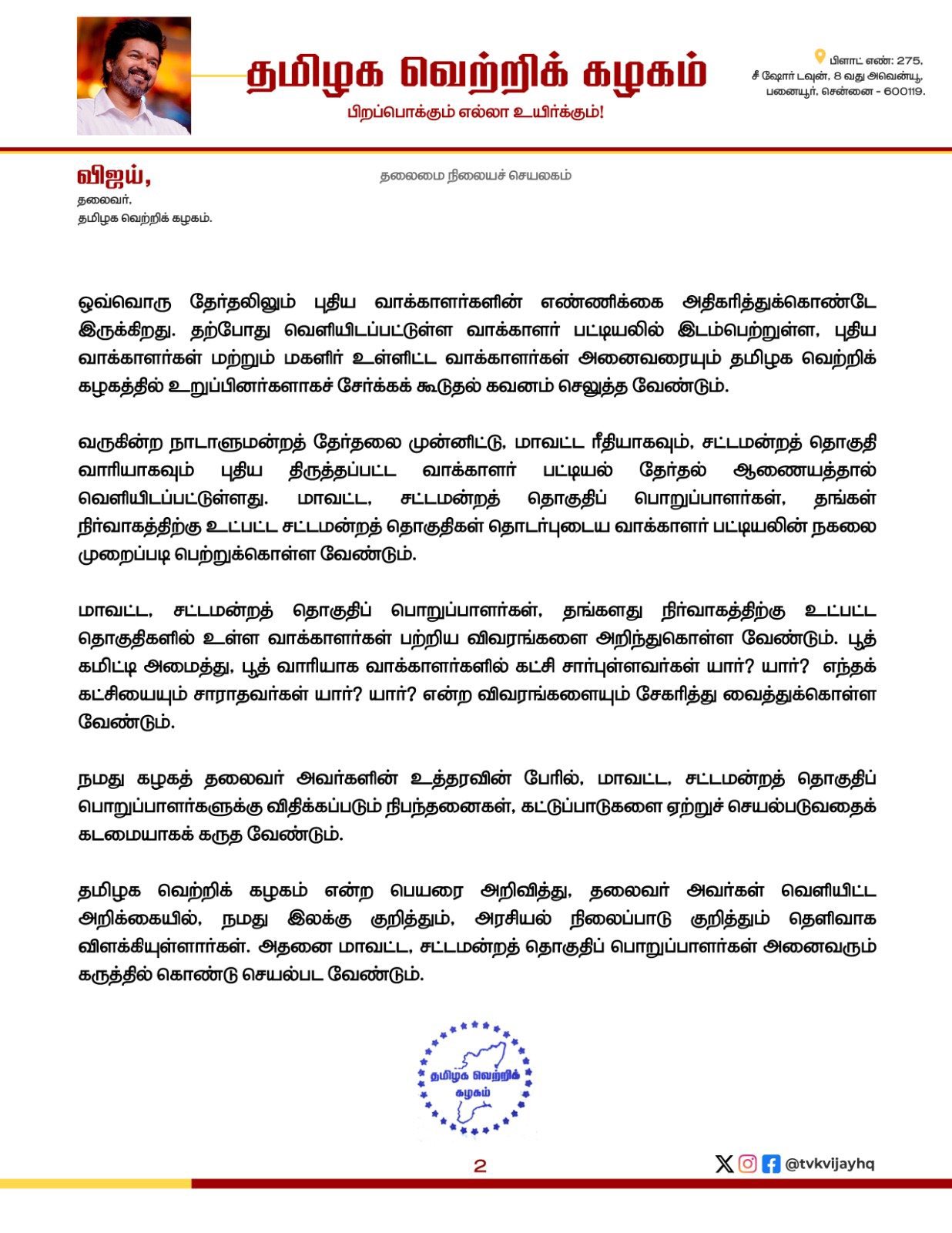 தமிழக வெற்றி கழக கட்சியில் 2 கோடி உறுப்பினர்களை சேர்க்க வேண்டும் என நடிகரும், கட்சியின் தலைவருமான விஜய் நிர்வாகிகளுக்கு உத்தரவிட்டுள்ளார்.