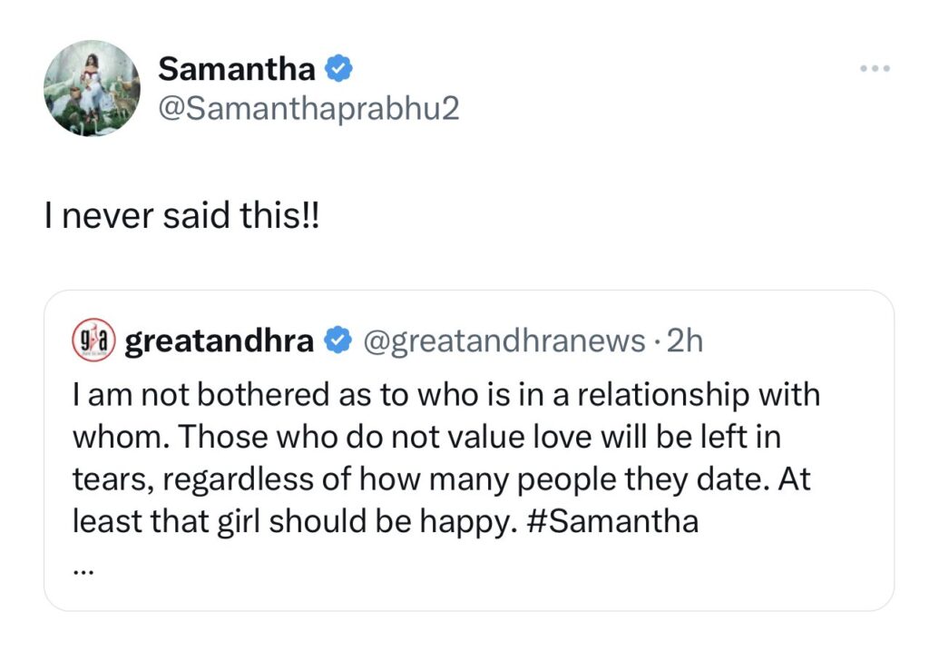 இந்நிலையில் அந்த செய்தியைப் பகிர்ந்த சமந்தா “நான் அப்படி சொல்லவே இல்லை” என்று மறுப்பு தெரிவித்து வதந்திகளுக்கு முற்றுப்புள்ளி வைத்துள்ளார்.