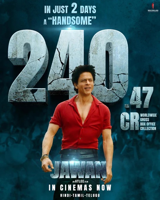 தமிழ் திரைப்பட இயக்குனர் அட்லி மற்றும் பாலிவுட் சூப்பர் ஸ்டார் ஷாருக்கான் கூட்டணியில் உருவான ஜவான் திரைப்படம் செப்டம்பர் 7ஆம் தேதி திரையரங்குகளில் ரிலீசாகி சக்கை போடு போட்டு வருகிறது. இப்படத்தில் நயன்தாரா, விஜய் சேதுபதி, அனிருத் என தமிழ் பிரபலங்கள் அதிகம் பங்கு பெற்றுள்ளனர். எனவே படம் தமிழிலும் நல்ல வசூலை பெற்று வருகிறது. திரைப்படம் ரிலீஸ் ஆன முதல் நாளில் உலகம் முழுவதும் 129.6 கோடியை வசூல் செய்தது. வேற எந்த பாலிவுட் சினிமாவும் முதல் நாளில் இந்த வசூலை எட்டியதில்லை. இந்நிலையில் ஜவான் திரைப்படம் ரிலீஸ் ஆன இரண்டே நாளில் 240 கோடிக்கு மேல் வசூல் செய்து சாதனை படைத்துள்ளது.