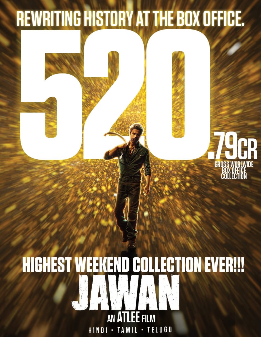 இயக்குனர் அட்லி இயக்கத்தில் ஷாருக்கான் விஜய் சேதுபதி நயன்தாரா நடிப்பில் செப்டம்பர் 7 அன்று வெளியான ஜவான் திரைப்படம் மிகப்பெரிய வசூல் சாதனையை நிகழ்த்தி வருகிறது. இப்படம் ஹிந்தி பாக்ஸ் ஆபிஸ் மட்டுமல்லாமல் தென்னிந்திய மொழிகளிலும் வசூலை வாரி குவித்து வருகிறது. ரிலீசான வெறும் 5 நாட்களில் இப்படம் 520 கோடியை தாண்டி அபார வசூலை பெற்றுள்ளது. சமீப காலமாக வெளியாகிய பாலிவுட் சூப்பர் ஸ்டாரின் திரைப்படங்கள் பெரியளவு வசூலை எட்டாத நிலையில் ஷாருக்கானின் பதான், ஜவான் படங்கள் நல்ல வரவேற்பை பெற்றுள்ளன.