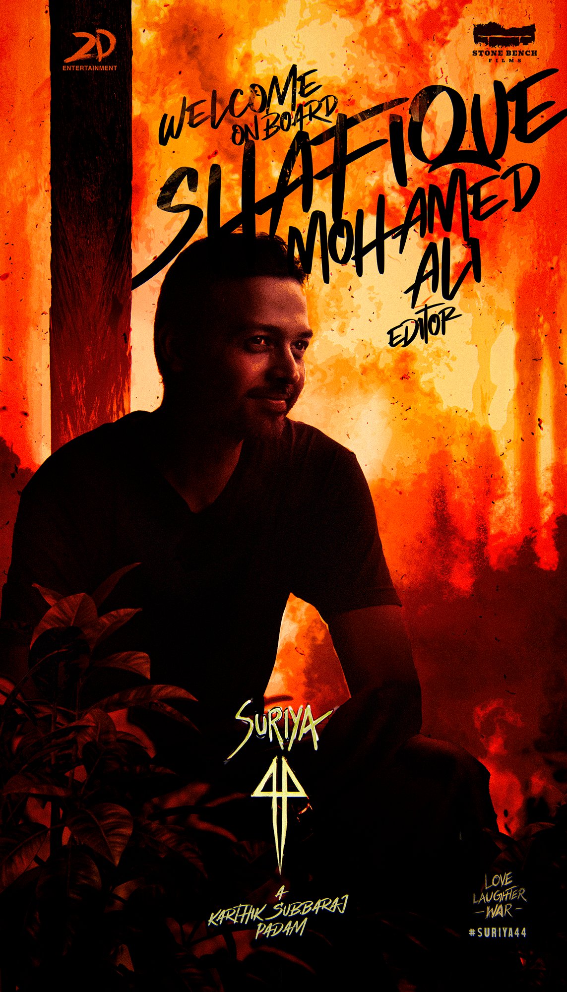 இதையடுத்து சூர்யா நடிக்கும் 44-வது திரைப்படத்தை கார்த்திக் சுப்பராஜ் இயக்குவதாக அண்மையில் அதிகாரப்பூர்வமாக அறிவிக்கப்பட்டது. சூர்யாவின் 2D என்டர்டெயின்மென்ட் நிறுவனமும், கார்த்திக் சுப்பராஜின் ஸ்டோன் பெஞ்ச் தயாரிப்பு நிறுவனமும் இணைந்து இத்திரைப்படத்தை தயாரிக்கின்றன. படத்திற்கு சந்தோஷ் நாராயணன் இசை அமைக்கிறார். இந்நிலையில், படக்குழு குறித்த தகவல் வெளியாகி உள்ளது. அதன்படி, படத்தின் ஒளிப்பதிவாளராக ஷ்ரேயாஸ் கிருஷ்ணா இணைந்துள்ளார். படத்தொகுப்பாளராக முகமது அலி இணைந்திருக்கிறார். சண்டை காட்சி இயக்குநராக கெச்சா இணைந்துள்ளார். மேலும், படக்குழுவினர் குறித்த அடுத்தடுத்து அப்டேட் அறிவிக்கப்பட்டு வருகிறது.
