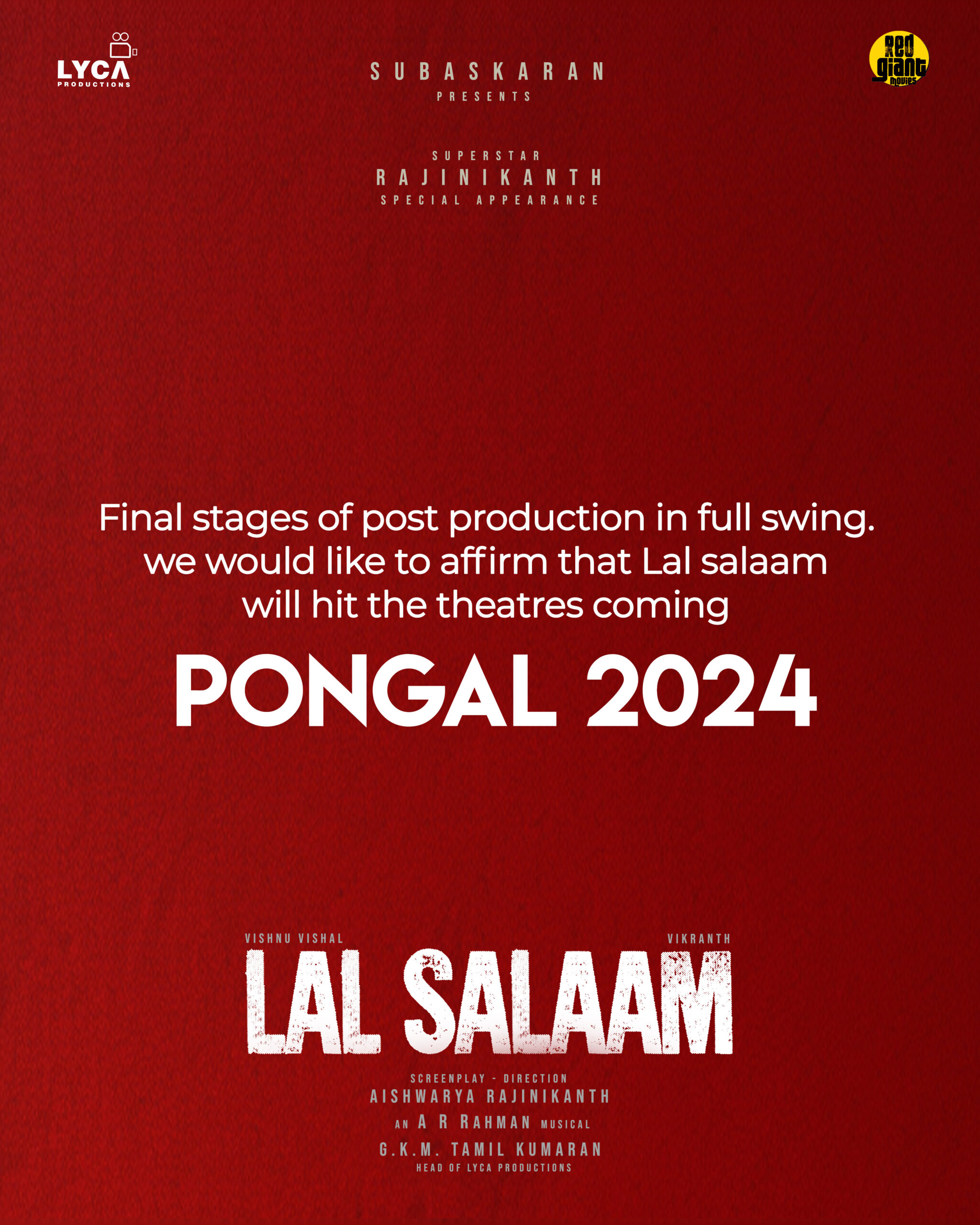 ஐஸ்வர்யா ரஜினிகாந்த் 3, வை ராஜா வை உள்ளிட்ட படங்களுக்குப் பிறகு இயக்கியுள்ள திரைப்படம் தான் லால் சலாம். இதில் விஷ்ணு விஷால் மற்றும் விக்ராந்த் இருவரும் முன்னணி கதாபாத்திரங்களில் நடித்துள்ளனர். மேலும் ரஜினியும் முக்கிய கதாபாத்திரத்தில் நடித்துள்ளார். இவருக்கு ஜோடியாக நிரோஷா நடித்துள்ளார். லைக்கா நிறுவனத்தின் தயாரிப்பில் உருவாகியுள்ள இந்த படத்திற்கு ஏ ஆர் ரகுமான் இசையமைத்துள்ளார். சமீபத்தில் படத்தின் படப்பிடிப்புகள் முழுவதும் நிறைவடைந்ததாக அறிவிக்கப்பட்டது.