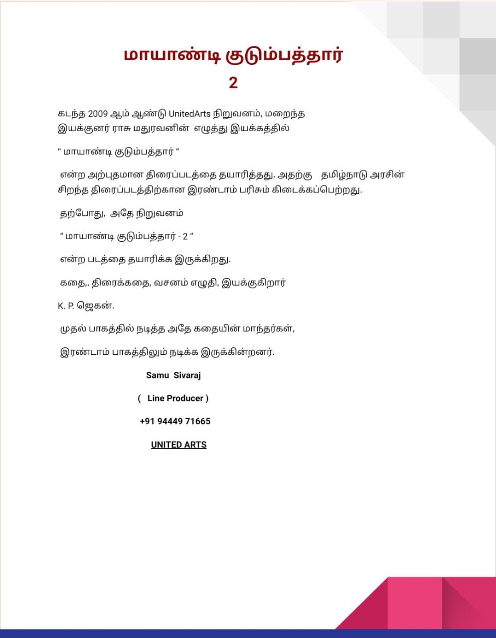 தமிழ் திரைப்படங்களில் அடையாளமாக திகழும் மாயாண்டி குடும்பத்தார் படத்தின் இரண்டாம் பாகம் விரைவில் உருவாக உள்ளது.