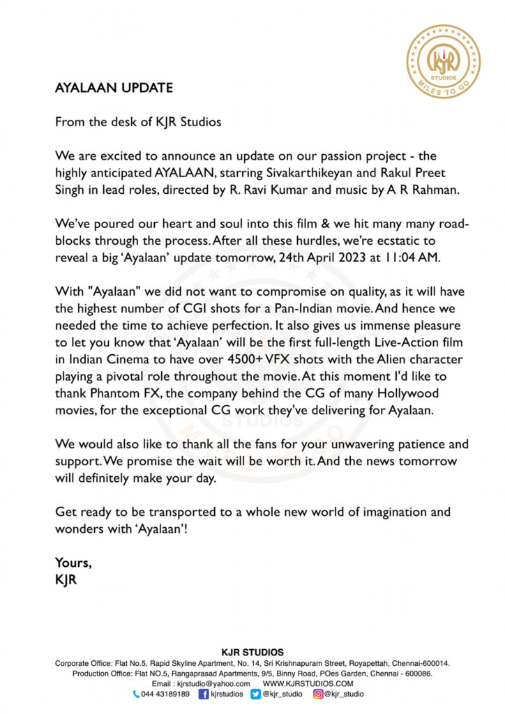 “சிவகார்த்திகேயன் மற்றும் ரகுல் ப்ரீத் சிங் ஆகியோர் முக்கிய வேடங்களில் நடித்துள்ள, ஆர். ரவிகுமார் இயக்கத்தில், ஏ.ஆர்.ரஹ்மான் இசையில், எங்களின் பிரம்மாண்ட படைப்பு ‘அயலான்’ பற்றிய புதிய அறிவிப்பை வெளியிடுவதில் நாங்கள் பெரும் மகிழ்ச்சியடைகிறோம். இந்த திரைப்படத்தை இடைவிடாத கடின உழைப்பை செலுத்தி படமாக்கியுள்ளோம். மேலும் பல தடைகளை தாண்டி, நாளை ஏப்ரல் 24, 2023 காலை 11:04 மணிக்கு ‘அயலான்’ அறிவிப்பை வெளியிடுவதில் மகிழ்ச்சி அடைகிறோம். ‘அயலான்’ மூலம் கற்பனைக்கு அப்பாற்பட்ட, அதிசயங்கள் நிறைந்த புதிய உலகத்திற்கு செல்ல தயாராகுங்கள்!