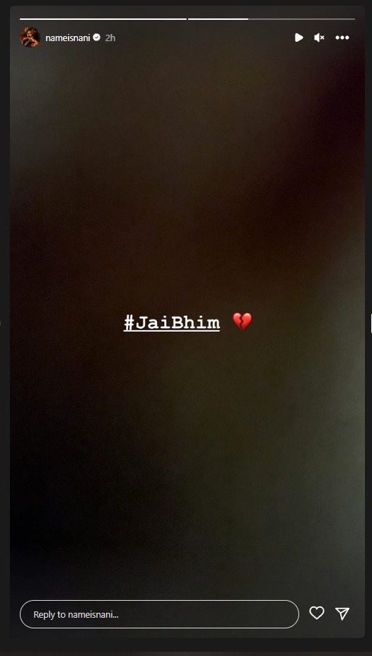 ஆனால் ‘ஜெய் பீம்’ படத்திற்கு ஒரு விருது கூட கிடைக்காதது பலருக்கு ஏமாற்றத்தை ஏற்படுத்தியுள்ளது. இந்நிலையில் நடிகர் நானி தேசிய விருதுகள் அறிவிக்கப்பட்ட தினத்தில் ‘ஜெய் பீம்’ என்று பதிவிட்டு இதயம் நெருங்கிய எமோஜியை பதிவு செய்துள்ளார். இதன் மூலம் ‘ஜெய் பீம்’ படத்திற்கு விருது கிடைக்காததற்கு தனது வருத்தத்தை அவர் வெளிப்படுத்தி உள்ளார்.