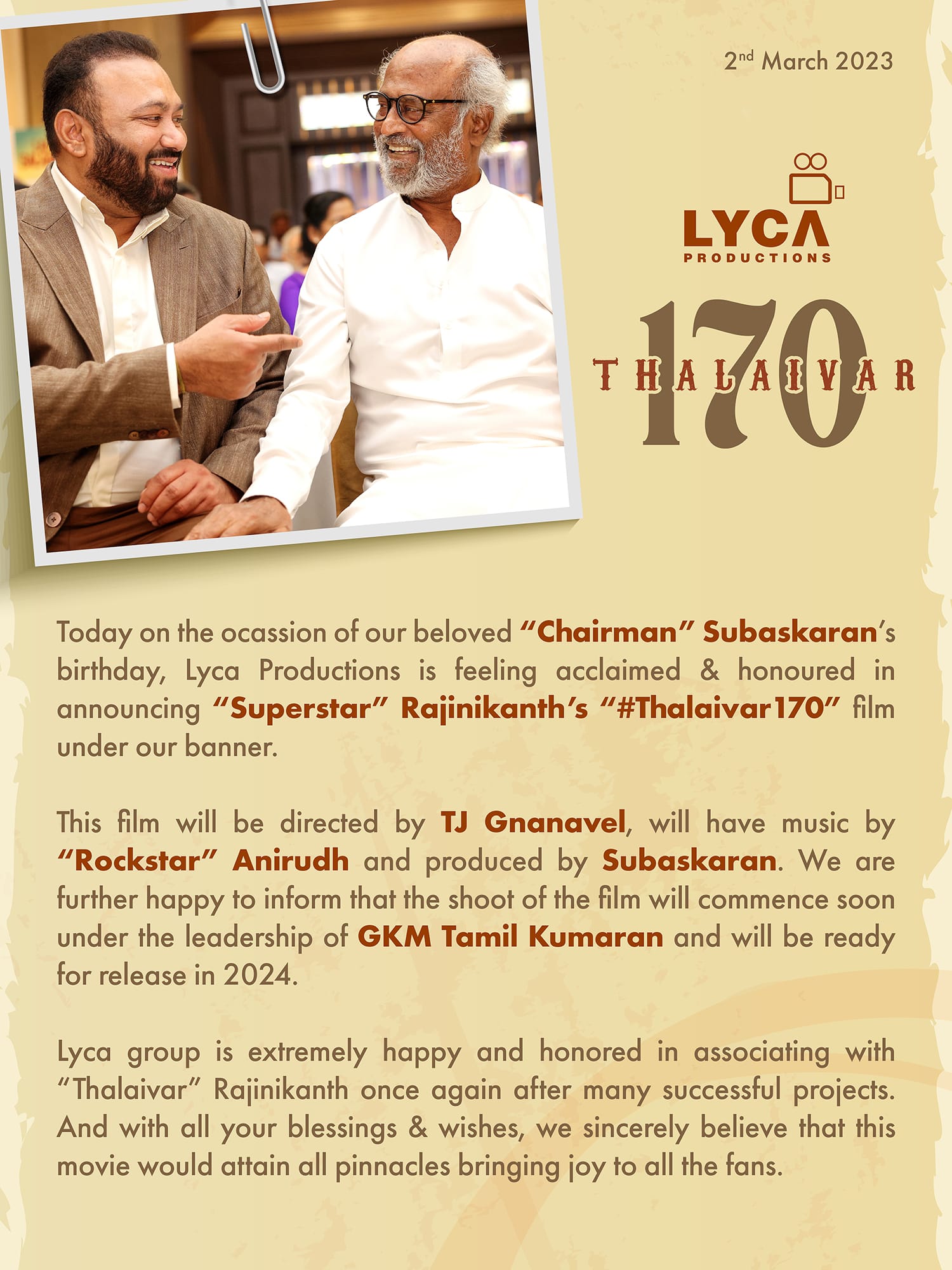 நடிகர் ரஜினிகாந்தின் 170-வது படம் குறித்த அதிகாரபூர்வ அறிவிப்பு வெளியானது.
