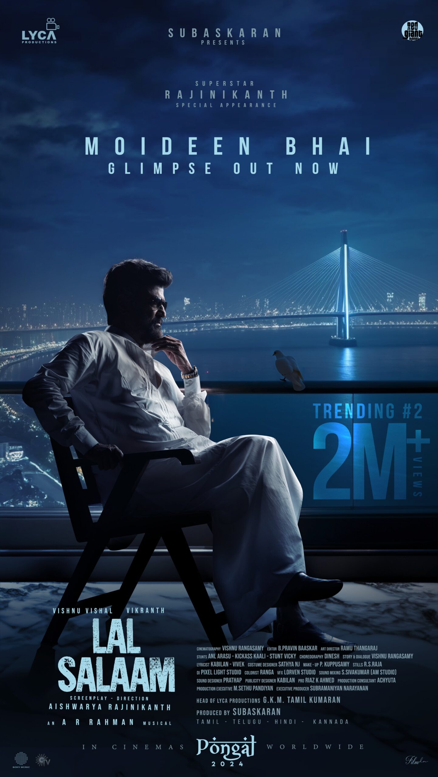 நடிகர் ரஜினிகாந்தின் மூத்த மகள் ஐஸ்வர்யா ரஜினிகாந்த் இயக்கியுள்ள திரைப்படம் லால் சலாம். இந்தப் படத்தில் மொய்தீன் பாய் என்ற கதாபாத்திரத்தில் ரஜினிகாந்த் கௌரவ வேடத்தில் நடித்துள்ளார். இவருக்கு ஜோடியாக நிரோஷா நடித்துள்ளார். படத்தில் விக்ராந்த், விஷ்ணு விஷால் இருவரும் முதன்மை கதாபாத்திரங்களில் நடித்திருக்கின்றனர். இப்படத்தில் கிரிக்கெட் நட்சத்திரம் கபில் தேவ், முக்கிய கதாபாத்திரத்தில் நடித்துள்ளார். படத்திற்கு ஏ.ஆர்.ரஹ்மான் இசை அமைத்துள்ளார். லைகா நிறுவனம் சார்பில் சுபாஷ்கரன் படத்தை தயாரித்துள்ளார். ரெட் ஜெயன்ட் நிறுவனம் தமிழகத்தில் படத்தை வெளியிடுகிறது. சமீபத்தில் படத்தின் படப்பிடிப்புகள் முழுவதும் நிறைவடைந்ததாக அறிவிக்கப்பட்டது.