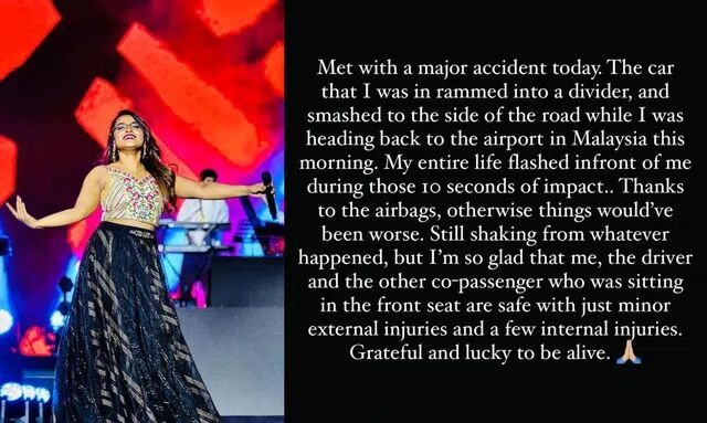 பாடகி ரக்ஷிதா சுரேஷ் தான் விபத்தில் சிக்கியுள்ளதாக தெரிவித்துள்ளார்.