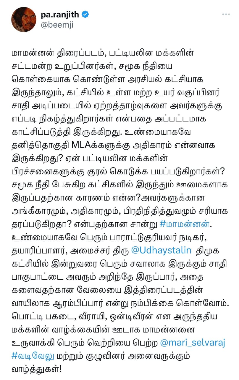 அந்த வகையில் இயக்குனர் பா ரஞ்சித் தனது ட்விட்டர் பக்கத்தில், “மாமன்னன் திரைப்படம் பட்டியலின மக்களின் சட்டமன்ற உறுப்பினர்கள், சமூக நீதியை கொள்கையாகக் கொண்டுள்ள அரசியல் கட்சியாக இருந்தாலும், கட்சியில் உள்ள மற்ற உயர் வகுப்பினர் சாதி அடிப்படையில் ஏற்றத்தாழ்வுகளை அவர்களுக்கு எப்படி நிகழ்த்துகிறார்கள் என்பதை அப்பட்டமாக காட்சிப்படுத்தி இருக்கிறது. உண்மையாகவே தனித்தொகுதி MLAக்களுக்கு அதிகாரம் என்னவாக இருக்கிறது? ஏன் பட்டியல் இன மக்களின் பிரச்சினைகளுக்கு குரல் கொடுக்க பயப்படுகிறார்கள்? சமூக நீதி பேசுகிற கட்சிகள் இருந்தும் ஊமையாக இருப்பதற்கான காரணம் என்ன? அவர்களுக்கான அங்கீகாரமும், அதிகாரமும், பிரதிநிதித்துவமும், சரியாக தரப்படுகிறதா? என்பதற்கான சான்று மாமன்னன். உண்மையாகவே பெரும் பாராட்டுக்குரியவர் நடிகர், தயாரிப்பாளர், அமைச்சர் திரு. உதயநிதி ஸ்டாலின். திமுக கட்சியில் இன்றுவரை பெரும் சவாலாக இருக்கும் சாதி பாகுபாட்டை அவரும் அறிந்தே இருப்பார். அதை களைவதற்கான வேலையை இத்திரைப்படத்தில் இருந்து ஆரம்பிப்பார் என்று நம்பிக்கை கொள்வோம். பொட்டி பகடை, வீராயி, ஒண்டிவீரன் என அருந்ததிய மக்களின் வாழ்க்கையின் ஊடாக மாமன்னனை உருவாக்கி பெரும் வெற்றியைப் பெற்ற வடிவேலு மற்றும் குழுவினர் அனைவருக்கும் வாழ்த்துக்கள்!” என்று பதிவிட்டுள்ளார்.