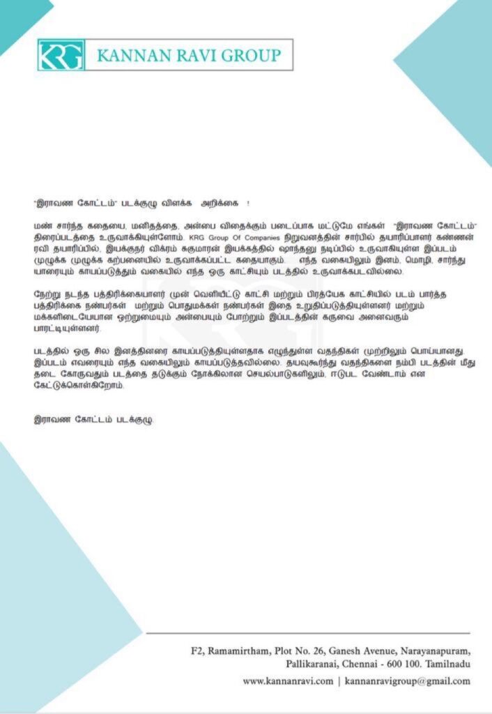 இதற்கிடையில் இராவணக் கோட்டம் படம் சாதியம் சார்ந்த படம் என்று பல கருத்துக்கள் நிலவி வருவதால் தற்போது அதுகுறித்து படக்குழுவினர் தெளிவுபடுத்தியுள்ளனர்.