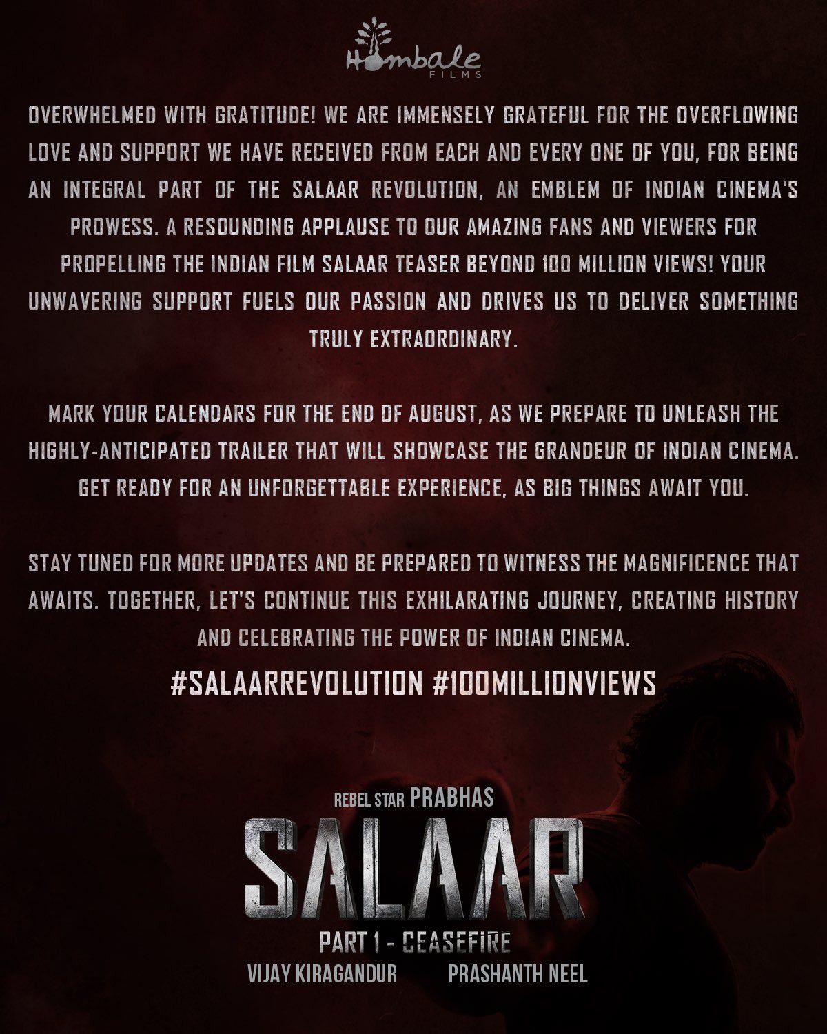 பிரபாஸ் தற்போது ப்ராஜெக்ட் கே திரைப்படத்தில் நடித்து வருகிறார். அதே சமயம் பிரசாந்த் நீல் இயக்கத்தில் சலார் திரைப்படத்தில் நடித்து வருகிறார். இந்த படத்தை ஹோம்பாலே பிலிம்ஸ் நிறுவனம் தயாரித்து வருகிறது ரவி பசூர் இதற்கு இசை அமைக்கிறார். இதில் பிரபாஸுடன் இணைந்து ஸ்ருதிஹாசன், ஜெகதீபாபு, உள்ளிட்டோர் முக்கிய கதாபாத்திரங்களில் நடிக்கின்றனர். மேலும் இப்படம் வருகின்ற செப்டம்பர் 28ஆம் தேதி தமிழ், தெலுங்கு, இந்தி, மலையாளம், கன்னடம் உள்ளிட்ட மொழிகளில் உலகம் முழுவதும் வெளியாக இருக்கிறது.