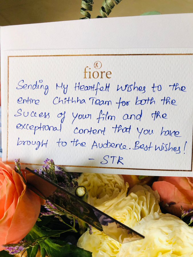 இந்நிலையில் நடிகர் சிம்பு சித்தா பட குழுவினருக்கு பூங்கொத்து ஒன்றை பரிசளித்து தனது வாழ்த்துக்களை தெரிவித்துள்ளார். அதன்படி, ” உங்களின் வெற்றிக்காகவும் பார்வையாளர்களுக்கு விதிவிலக்கான கதையை கொடுத்ததற்காகவும் எனது மனமார்ந்த வாழ்த்துக்கள்” என்று தனது வாழ்த்துக்களை தெரிவித்துள்ளார்.