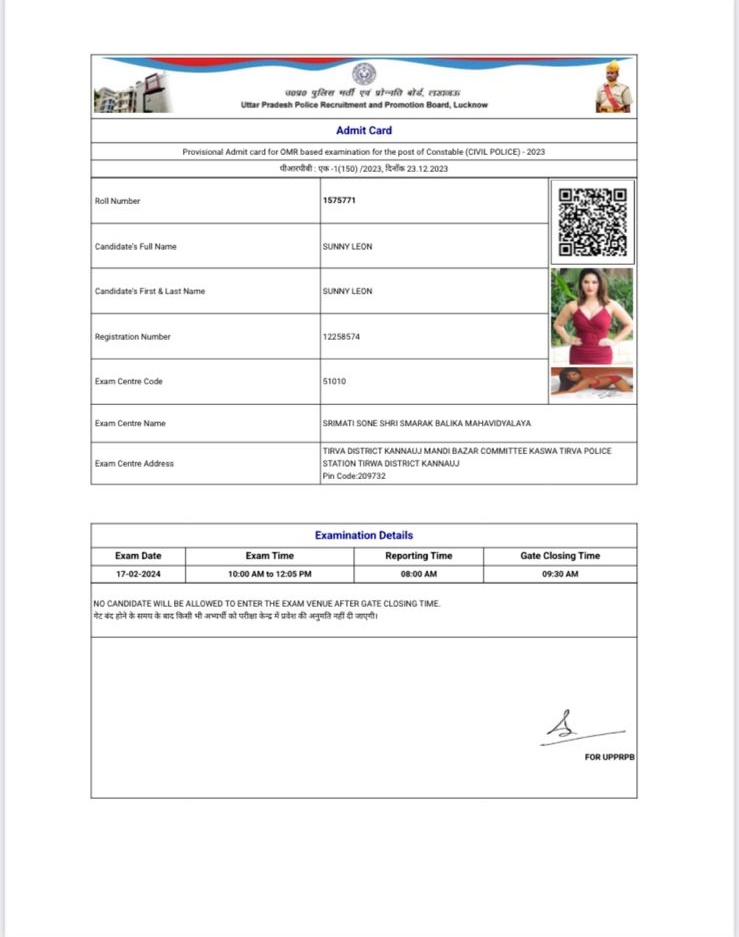 இந்நிலையில், உத்தரப் பிரதேச காவலர் தேர்வு அனுமதி சீட்டில், நடிகை சன்னி லியோனின் புகைப்படம் இடம்பெற்றுள்ளது. இதைக் கண்ட அரசியல் அதிகாரிகள் அதிர்ச்சி அடைந்தனர். இது தொடர்பாக போலீசார் விசாரணை நடத்தியதில், அது போலி அனுமதி சீட்டு என்பது தகவல் வெளியாகி உள்ளது.
