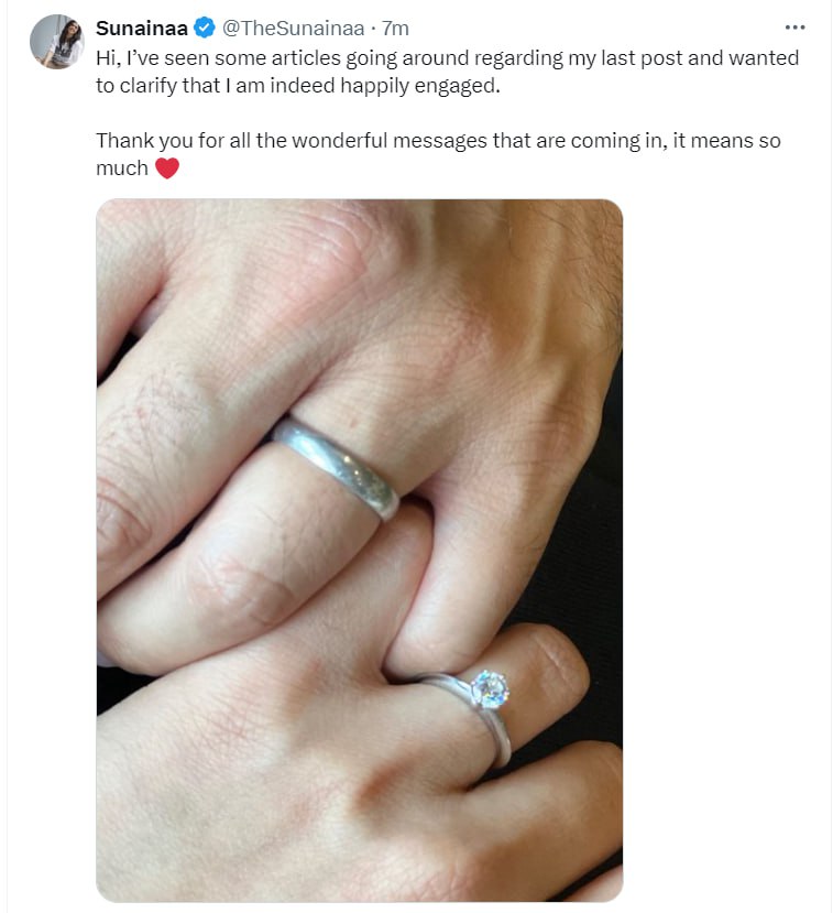 தனக்கு திருமண நிச்சயம் நிறைவு பெற்றதாக நடிகை சுனைனா, புகைப்படத்துடன் அறிவித்துள்ளார்.
