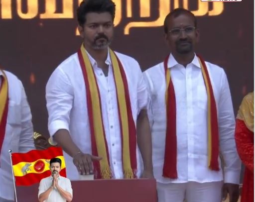 விஜய் மேடை ஏறியவுடன் தொண்டர்கள் ஆரவாரம் எழுப்பினர். பின்னர் மாநாட்டில் விஜய், கொள்கை தலைவர்களுக்கு மரியாதை செலுத்தியதை தொடர்ந்து த.வெ.க கொடியை பட்டனை அழுத்தி ஏற்றி வைத்தார். 100 அடி உயர கம்பத்தில் அக்கொடி பறக்க விடப்பட்டுள்ளது .