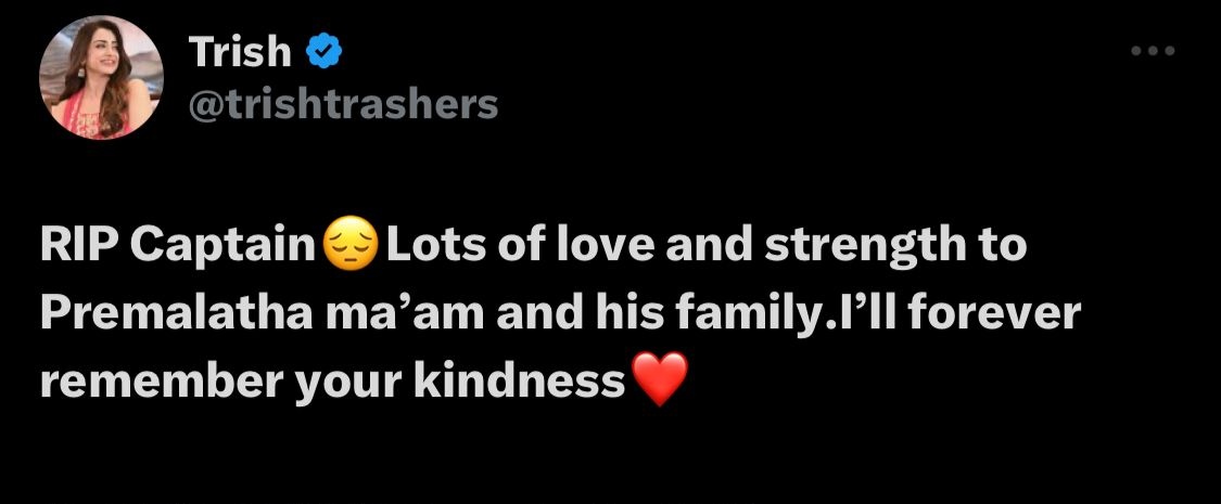 அதேபோல, கோலிவுட்டின் முன்னணி நடிகை த்ரிஷாவும் விஜயகாந்த் மறைவுக்கு இரங்கல் தெரிவித்து டிவிட்டரில் பதிவிட்டுள்ளார்.
