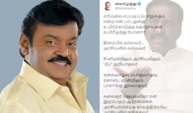 நடிகரும், அரசியல் தலைவருமான விஜயகாந்த் மறைவுக்கு கவிஞர் வைரமுத்து இரங்கல் தெரிவித்துள்ளார்.