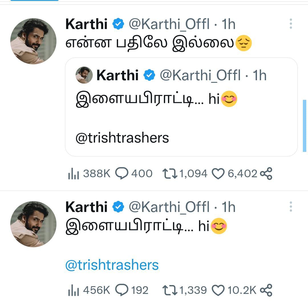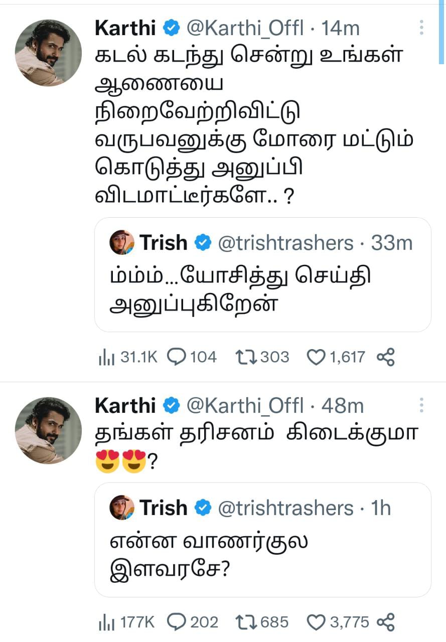 முதலில் ‘இளையபிராட்டியே… hi’ என திரிஷாவை அழைத்த கார்த்திக்கு குந்தவை எந்த பதிலும் அளிக்கவில்லை, மீண்டும் கார்த்தி ‘என்ன பதிலே இல்லை?’ என சோகமாக பதிவிட, உடனே அதற்கு ‘என்ன வாணர்குல இளவரசே?’ என திரிஷா பதிலளித்தார். இப்படியே மாறி மாறி டிவிட்டரில் பேசி ப்ரமோஷனில் ஈடுபட்டு வருகின்றனர்.
