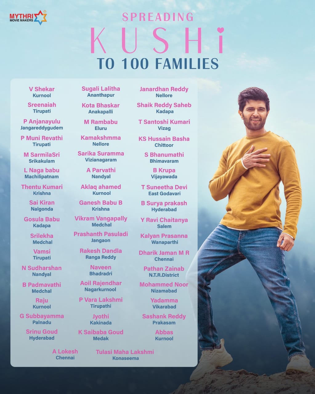 நடிகர் விஜய் தேவரகொண்டா மற்றும் சமந்தா நடிப்பில் செப்டம்பர் மாதம் 1ம் தேதி வெளியான குஷி திரைப்படம் 70 கோடிக்கு மேல் வசூல் செய்து சாதனை படைத்தது. இயக்குனர் ஷிவா நிர்வனா இப்படத்தை இயக்கியிருந்தார். இப்படத்தின் வெற்றியை கொண்டாடும் வகையில் வெற்றி விழா சமீபத்தில் கொண்டாடப்பட்டது. குஷி படம் ரிலீஸ் ஆகும் முன்பே 100 குடும்பங்களுக்கு ஒரு கோடியை வழங்குவேன் என்று அறிவித்திருந்தார்.