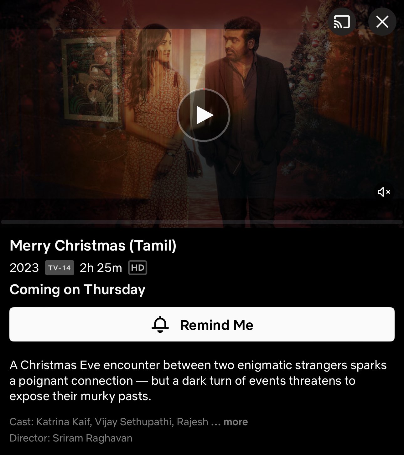 தமிழ், தெலுங்கு, மலையாளம் உள்பட அனைத்து தென்னிந்திய மொழிகளிலும் அசத்திய விஜய் சேதுபதி தற்போது பாலிவுட்டிலும் கவனம் செலுத்தி வருகிறார். ஜவான் படத்தின் வெற்றிக்கு பிறகு, விஜய் சேதுபதி நடிப்பில் ஹிந்தியில் இறுதியாக வெளியான திரைப்படம் மெரி கிறிஸ்துமஸ். திரைப்படத்தில் கத்ரினா கைஃப் நாயகியாக நடித்துள்ளார். ராதிகா சரத்குமார், டினு ஆனந்த், ராதிகா ஆப்தே, சஞ்சய் கபூர் ஆகியோர் முக்கிய கதாபாத்திரங்களில் நடித்திருந்தனர். ஸ்ரீராம் ராகவன் படத்தை இயக்கியிருக்கிறார். இத்திரைப்படம் பொங்கல் பண்டிகை முன்னிட்டு கடந்த 12ம் தேதி உலகம் முழுவதும் வெளியாகி வரவேற்பை பெற்றது.
