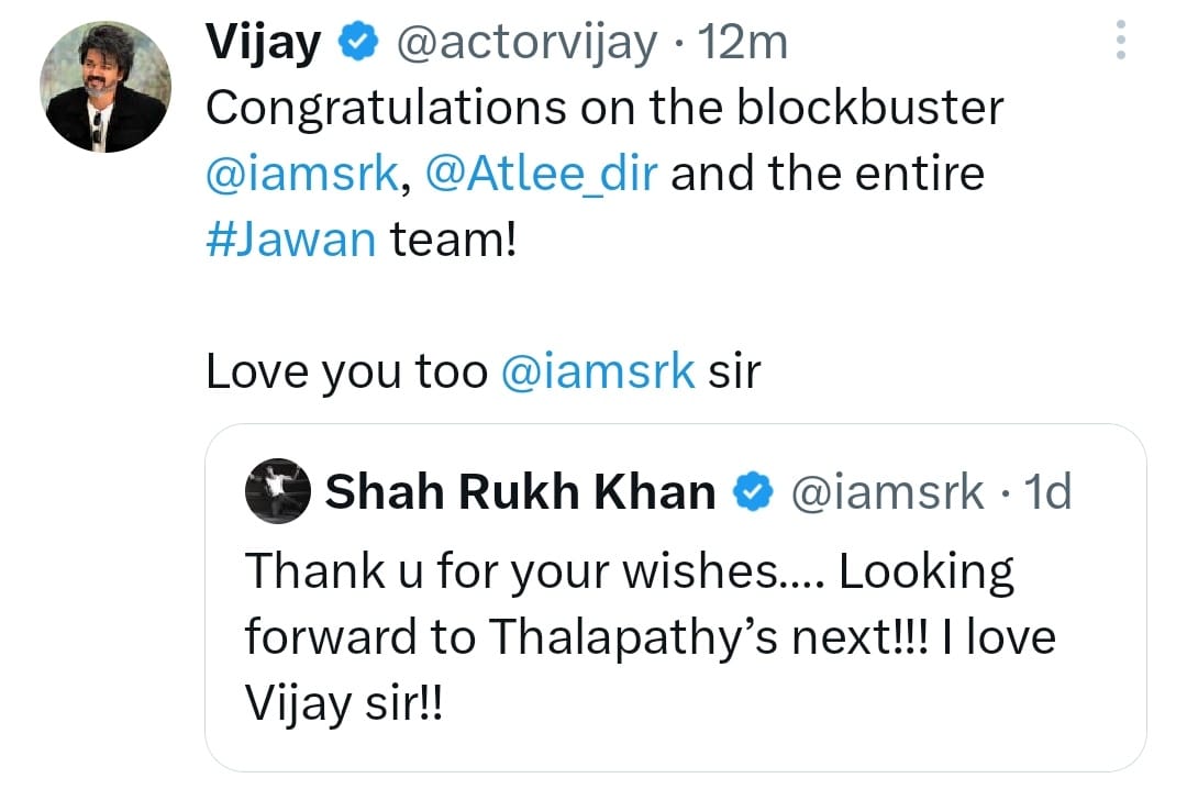 ஷாருக்கானின் இந்த ட்வீட்டுக்கு பதிலளிக்கும் விதமாக நடிகர் விஜய், ” ஜவான் திரைப்படம் பிளாக்பஸ்டர் ஹிட்டாகியதற்காக ஷாருக்கான், அட்லீ மற்றும் ஜவான் படக்குழுவினருக்கு எனது வாழ்த்துக்கள். லவ் யூ டூ ஷாருக் சார்” என்று பதிவிட்டுள்ளார். இது தற்போது சமூக வலைதளங்களில் வைரலாகி வருகிறது